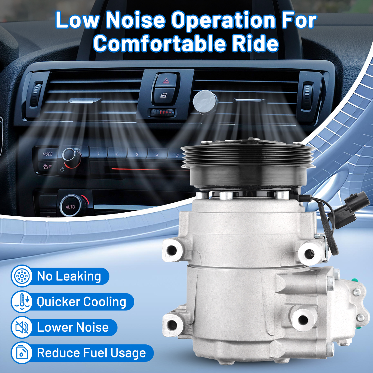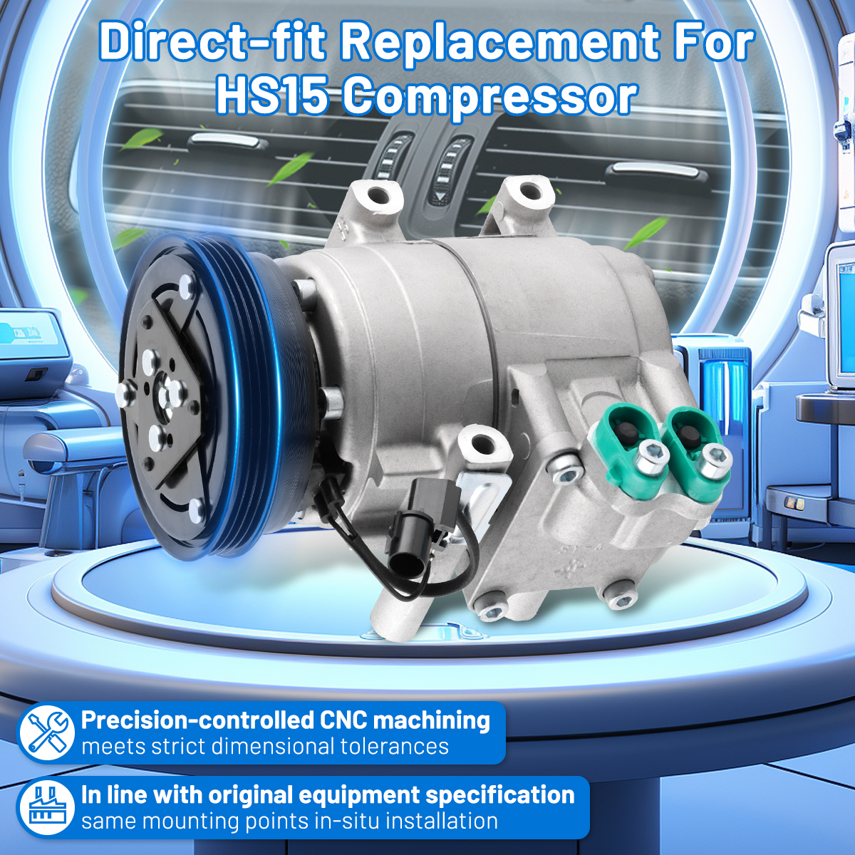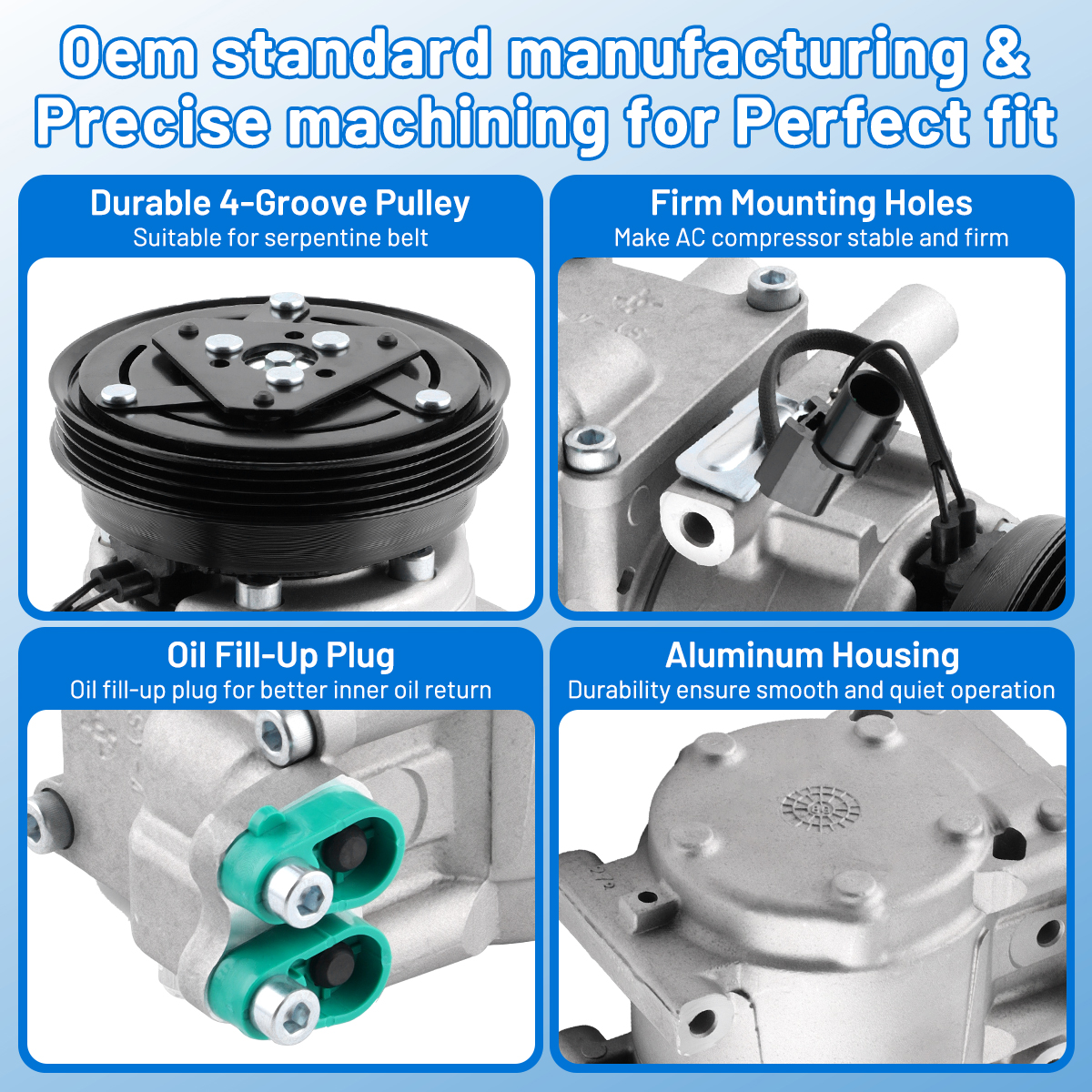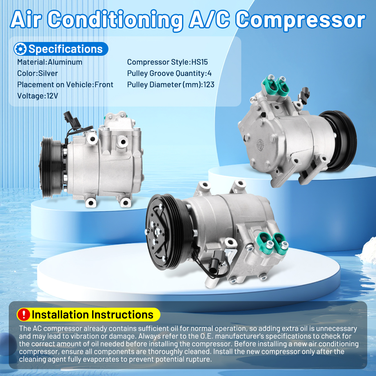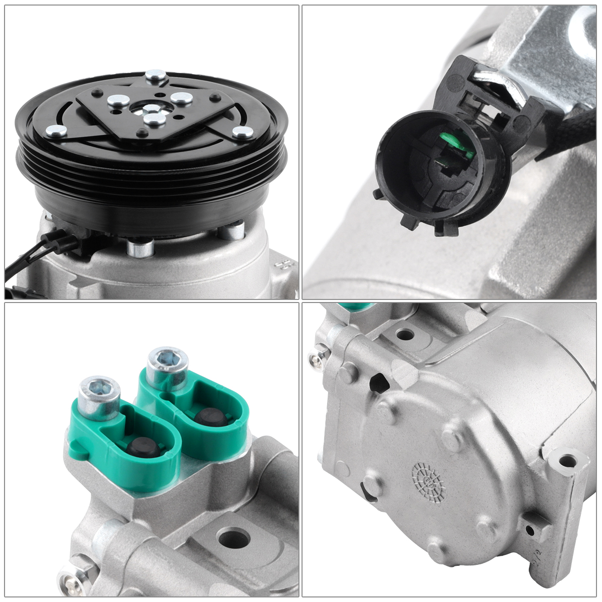 Features: Built to strict quality control standards 100% factory tested. 100% Compatible with OEM Parts, meets Original Equipment Manufacturer (OEM) Standards. This powerful auto AC compressor can provide intense pressure to achieve strong cooling effect, and it also manifests excellent performance in dissipating heat and ventilation.Longer life of the alternator through the use of premium brushes and other critical components that resist failure or poor performance. Our AC compressor kit works efficiently under low noise and tiny vibration to provide you a super cool trip. Driving at a stable speed will help reduce fuel consumption. The compressor is mainly made of high-strength aluminum alloy, therefore, it is not only durable but also ensures stability and a real long service life. Specifications: Material:Aluminum Color:Silver Placement on Vehicle:Front Voltage:12V Compressor Style:HS15 Pulley Groove Quantity:4 Pulley Diameter (mm):123 Part Numbers: CO 10926C, 67191, 68191, 77347, 78347, 977012C100, 977012D100, 977012E000 Fitment: 2005-2009 Hyundai Tucson 2.0L 2003-2008 Hyundai Tiburon 2.0L Package include: Attention: 1.Remove compressor, receiver drier or accumulator, orifice tube or expansion valve. 2.Flush the condenser and evaporator using NON-OIL BASED A/C flush. On expansion valve systems. The valve must be removed before the evaporator can be flushed. Flushed condensers from outlet to inlet and evaporators from inlet to outlet. 3.Drain all the oil from the new compressor and dispose of according to local, state and federal laws. (NOTE: if your compressor has a drain plug, you will need to open it up and drain what oil is in there too.) 4.Install half oil charge into the compressor and the remainder throughout the system. Turn compressor shaft 8-10 full revolutions to insure front seal and other internal parts are lubricated. 5.Install new receiver drier or accumulator and new orifice tube or expansion valve. 6.Evacuate the A/C system for a minimum of one hour. 7.After evacuation install half the refrigerant charge and let the system set for 1 minute. This will allow the refrigerant to pick up oil and spread more evenly throughout the system. 8.Start engine whit A/C controls on MAX AIR with door and windows open. 9.Add the remaining charge of refrigerant as called for by the manufacture. Note: It is necessary to add appropriate amount of oil and refrigerant to the ac compressor before use.