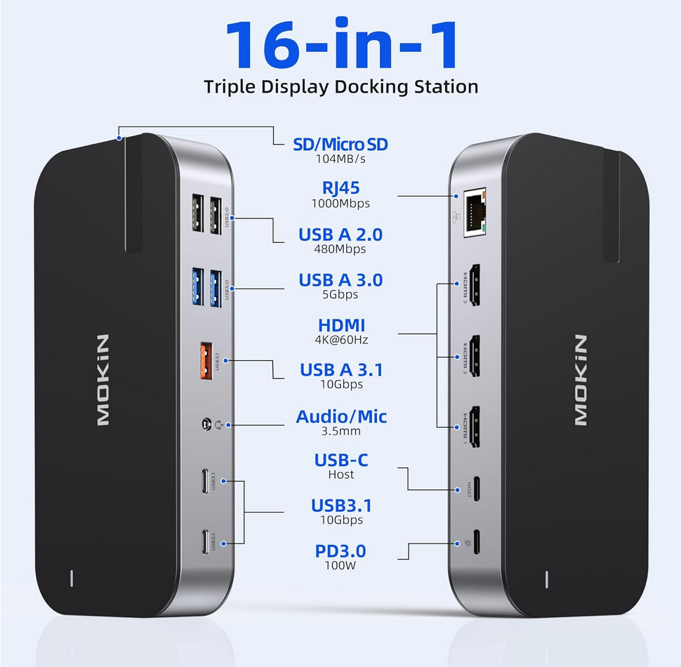 【Ultra 4K HD 3 HDMI Dock】MOKiN Laptop Docking Station for easy 4K HDMI, triple monitors on Windows OS. Using HDMI 1 only, up to 4K@60Hz, when connecting dual monitors, the 2 HDMI resolutions will be 4K@30Hz(Follow Your computer desktop resolution). Please Note: MacOS system laptops only support SST mode, the screen of the external monitor is the same, whether it is mirror or extend.