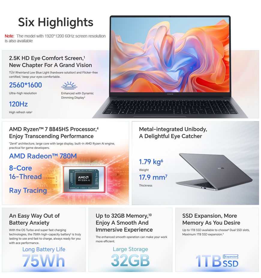R7|32GB|1TB|2.5K 2560*1600 120Hz, 430nits, 75Wh Battery.