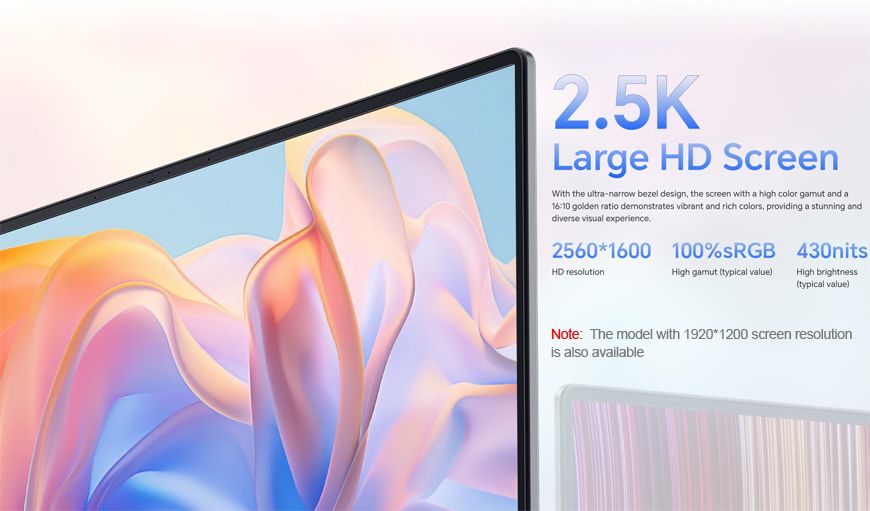 | Display | 16.0" IPS matte screen 2560*1600 / 1920 x 1200,142 PPI/189 PPI Colour gamut 100% sRGB 89% screen-to-body ratio*, 16:10 display ratio, 178° wide viewing angle, 300/430nits brightness, |
