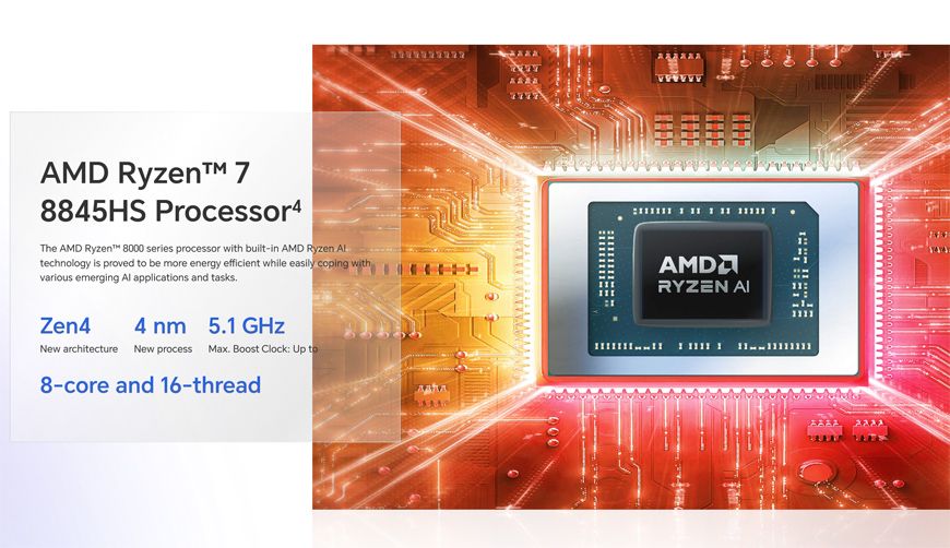 | Processor | AMD Ryzen™ 7 8845HS Processor, Base 3.8GHz,Up to 5.1GHz; |