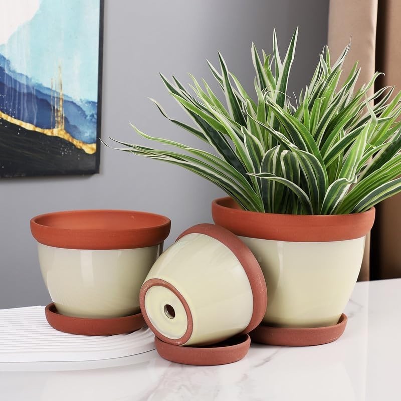 Elevate your indoor gardening experience with this exquisite set of three glazed terracotta pots featuring matching saucers. Crafted from premium materials, these pots showcase a vibrant wax yellow exterior paired with a warm terracotta interior—a striking visual that introduces the beauty of nature into your home.