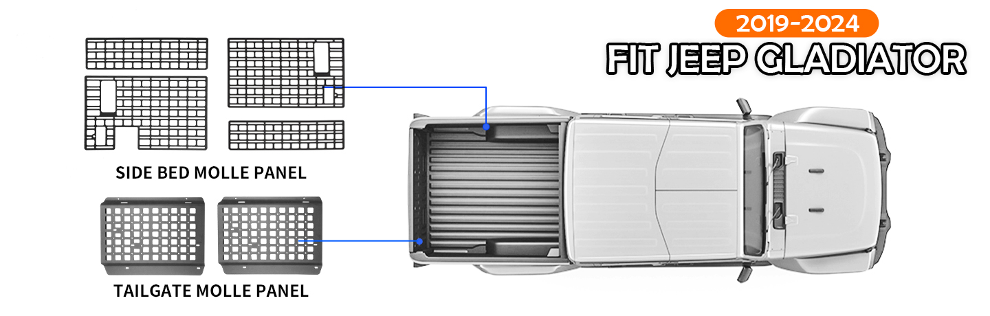 The tailgate molle panels and side bed molle panels perfectly are compatible with 2019 2020 2021 2022 2023 2024 Jeep Gladiator.It will fit the original truck well.