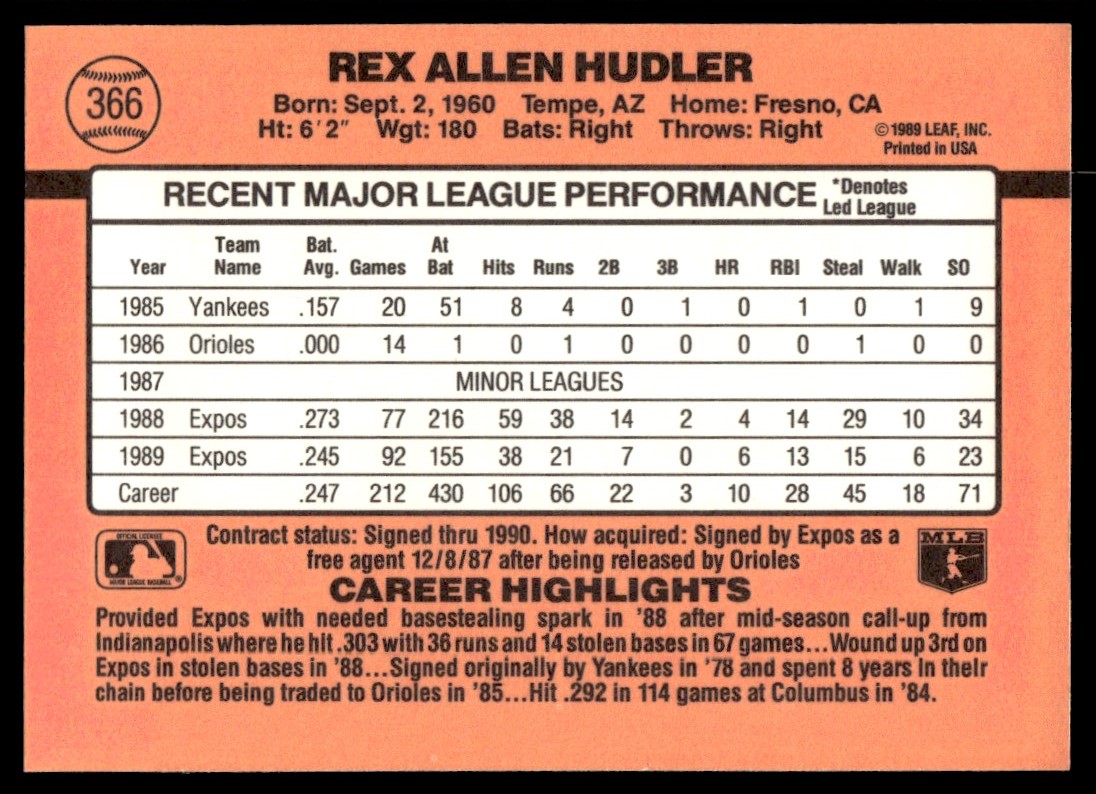 | 1990 Donruss Rex Hudler Montreal Expos #366 |