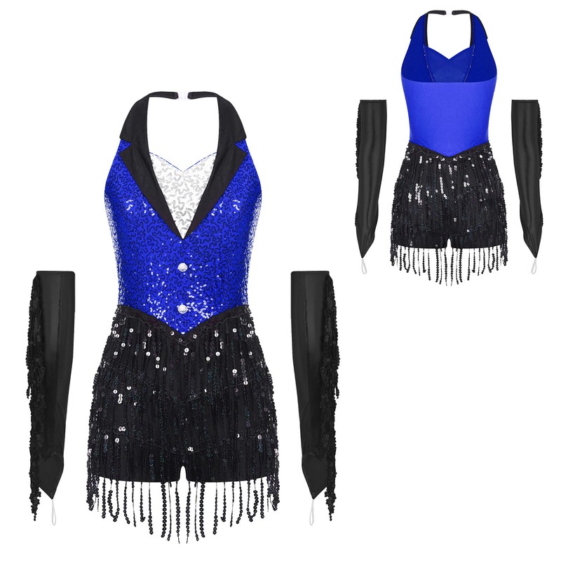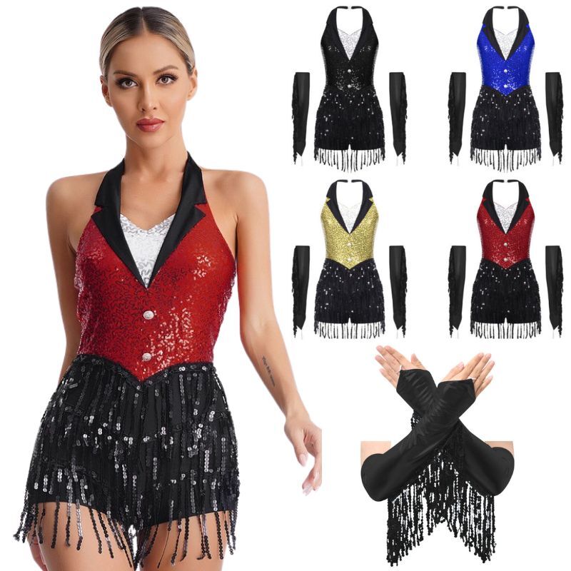 UK Women's Latin Jazz Dance Bodysuit Sparkly Sequins Leotard with Tassels Gloves