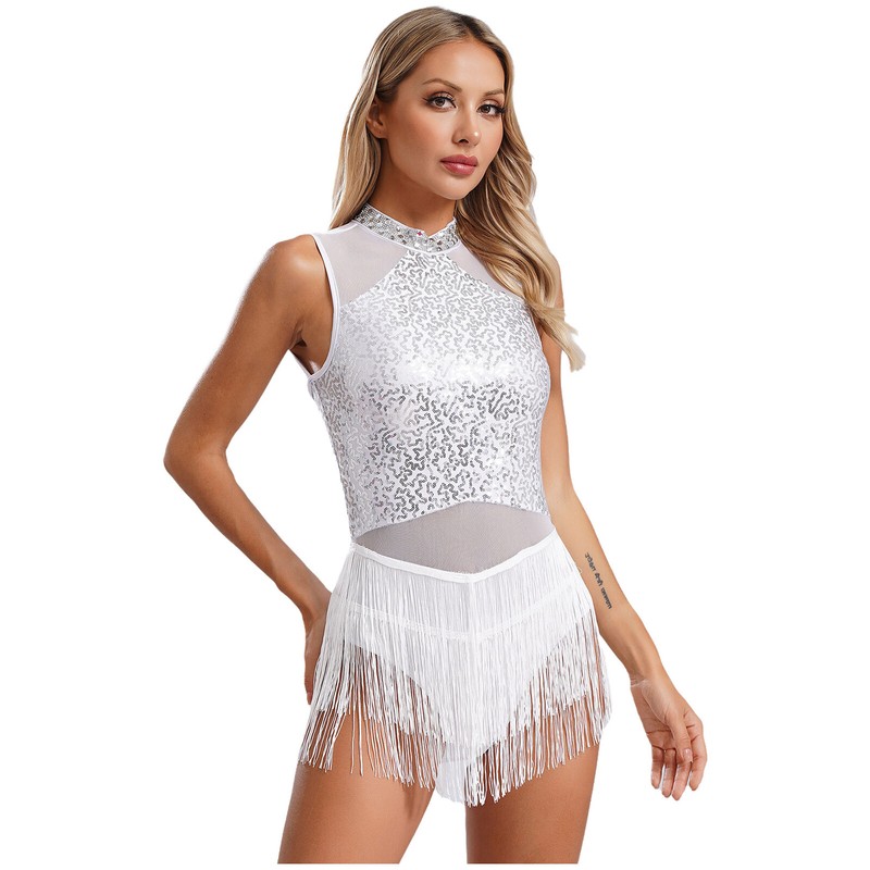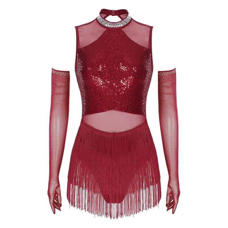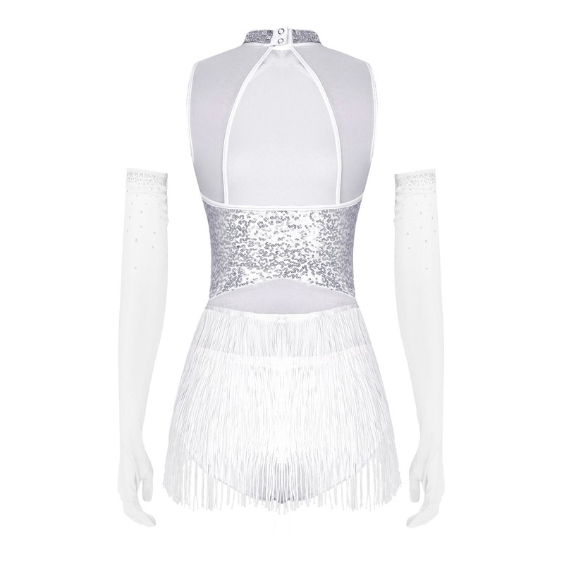 UK Women Latin Jazz Dance Bodysuit Shiny Sequins Fringe Tango Salsa with Gloves