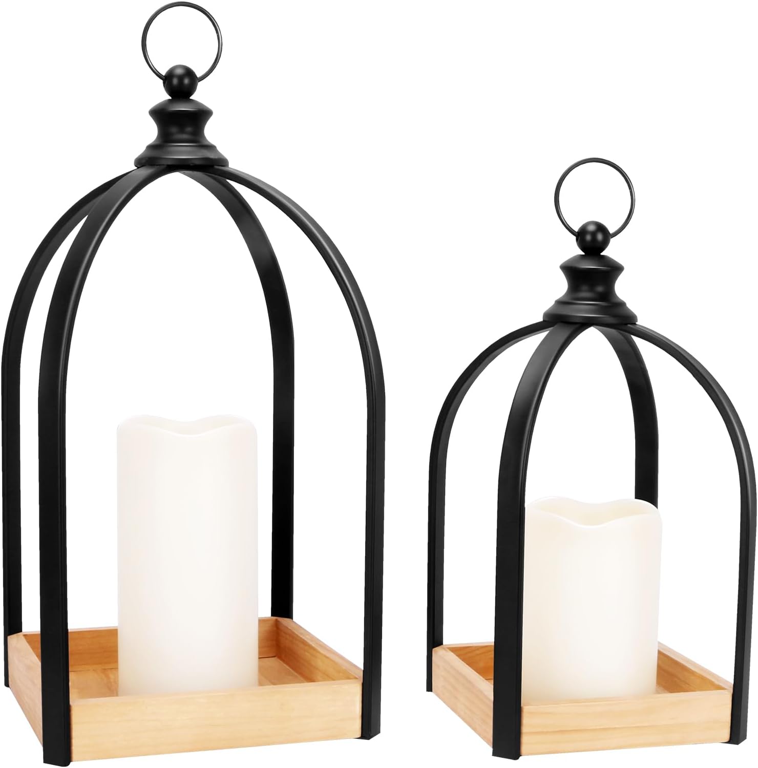 - Our decorative candle lanterns are crafted from high-quality metal and wood, designed to be both durable and safe. This set includes two lanterns and two candles: one large lantern (measuring 9.06 x 9.06 x 18.5 inches) and one small lantern (measuring 7.28 x 7.28 x 14.37 inches); one large candle (measuring 4.13 x 4.13 x 8.27 inches) and one small candle (measuring 4.13 x 4.13 x 5.91 inches). Each candle requires 3 C batteries (batteries not included).