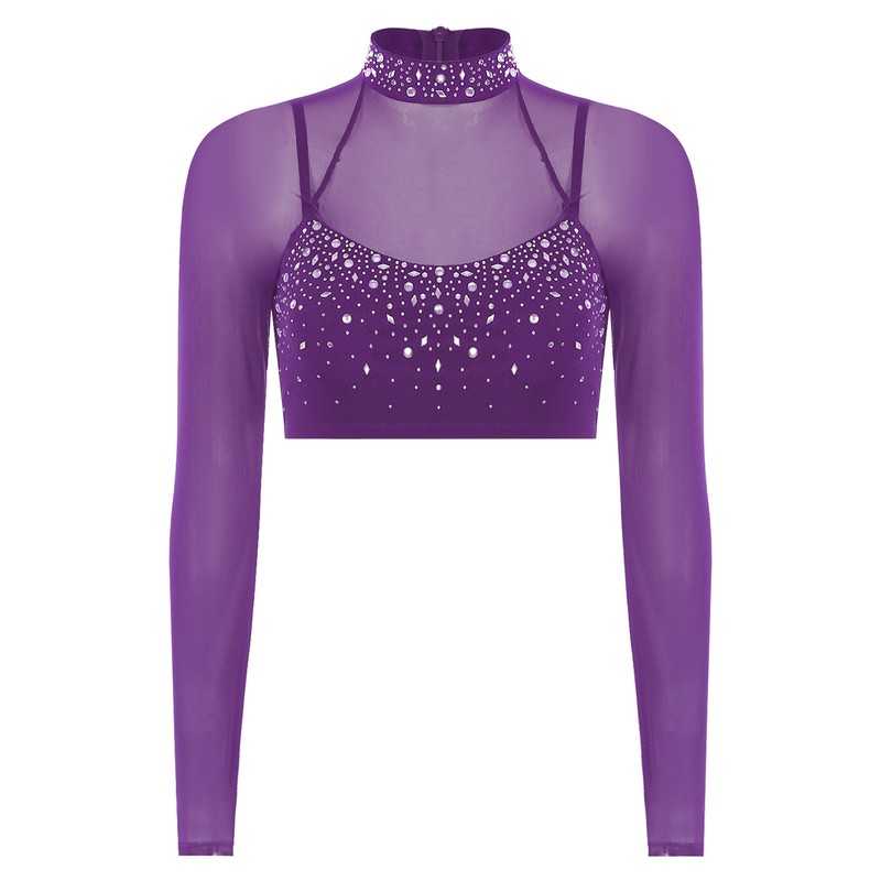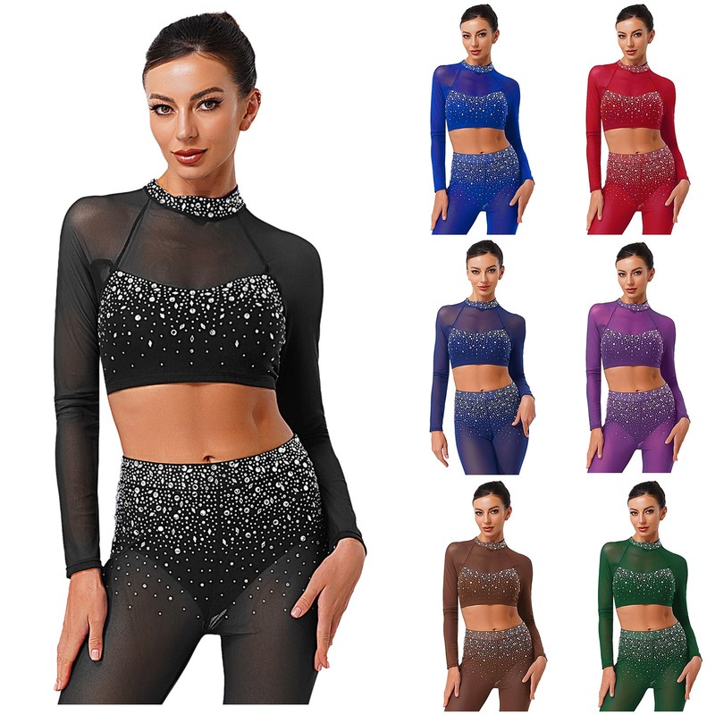 Womens Dancewear Long Sleeve Top Belly Crop Tops Ballet Rhinestone Mesh Dance