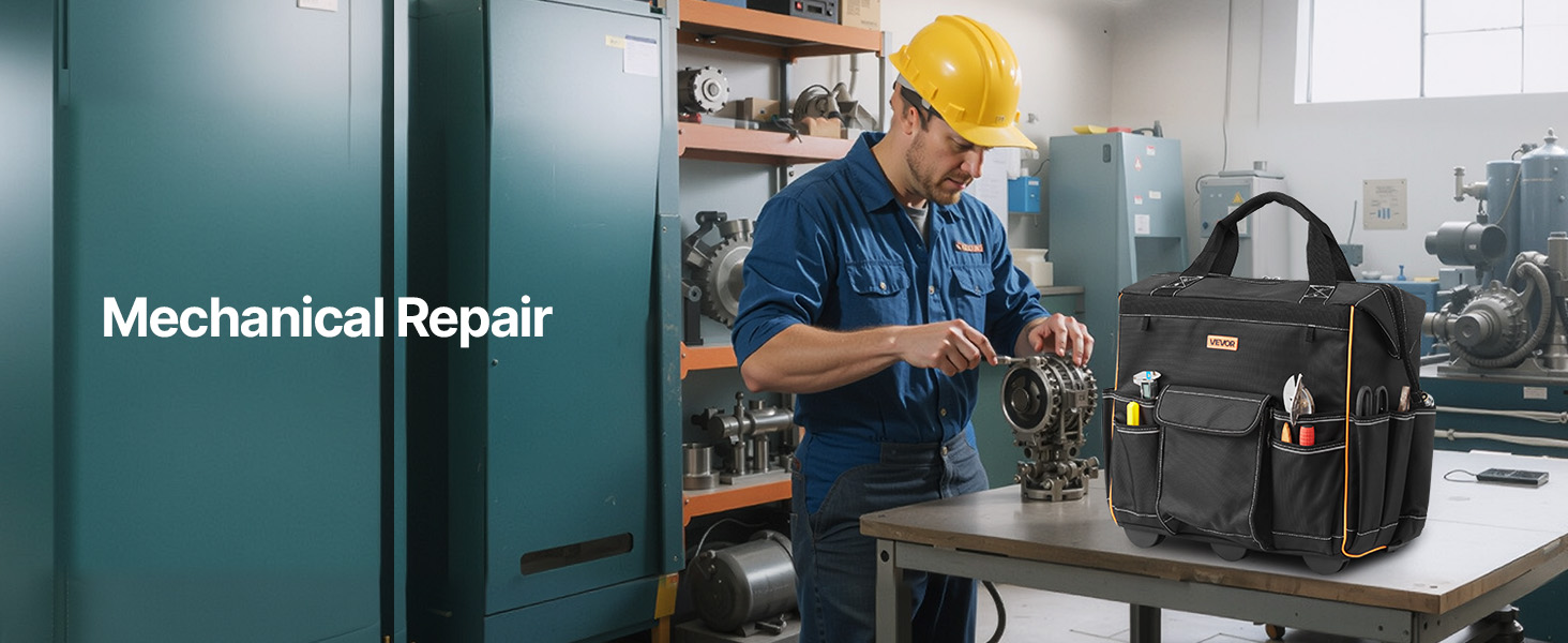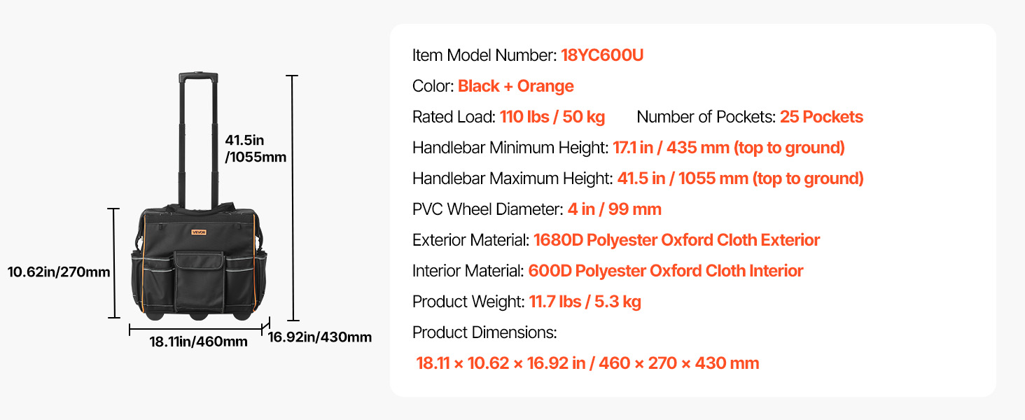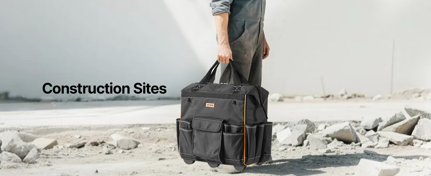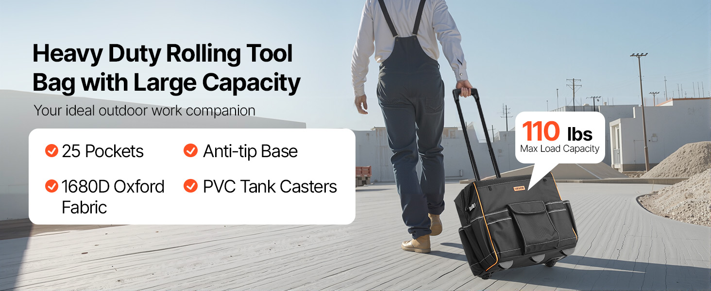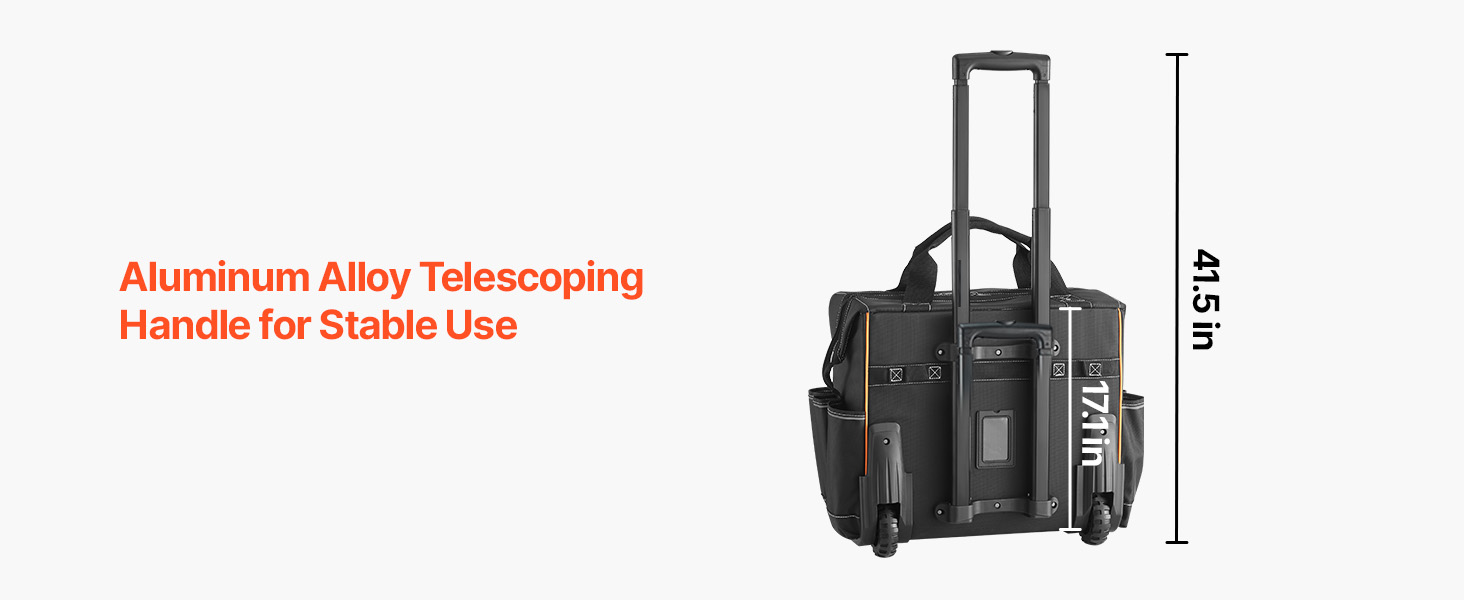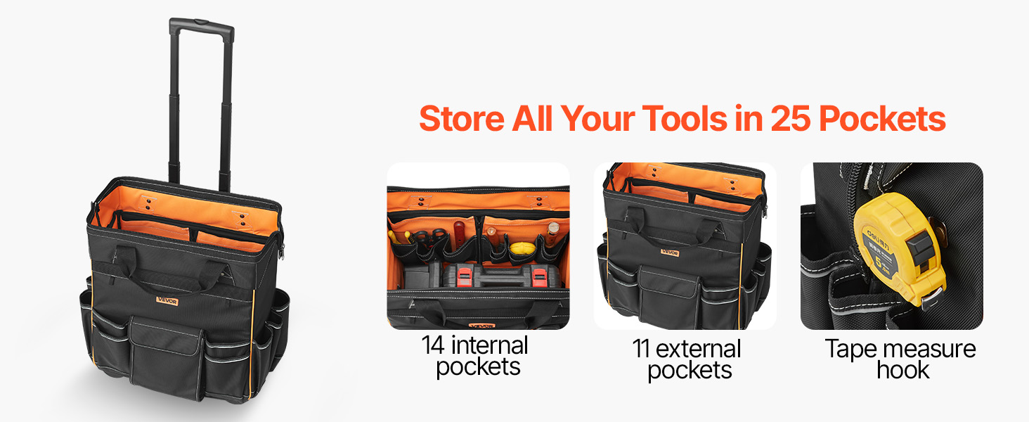 Con 25 tasche (14 interne, 11 esterne) e un gancio per metro a nastro, questa borsa portautensili con ruote è utile per tutto. Il manico regolabile da 41,5 pollici e le ruote da 4 pollici la rendono facile da spostare su qualsiasi superficie, migliorando l'efficienza.