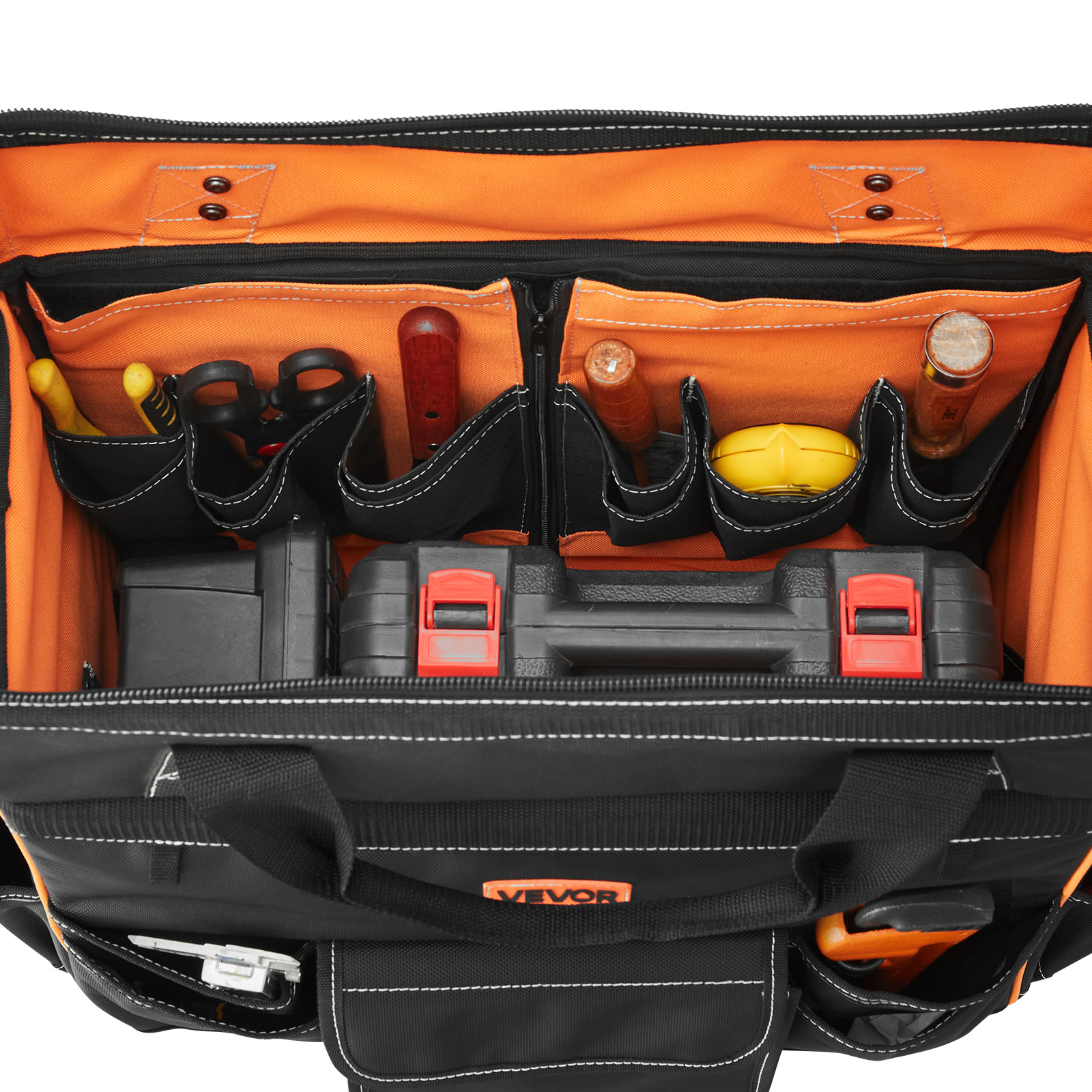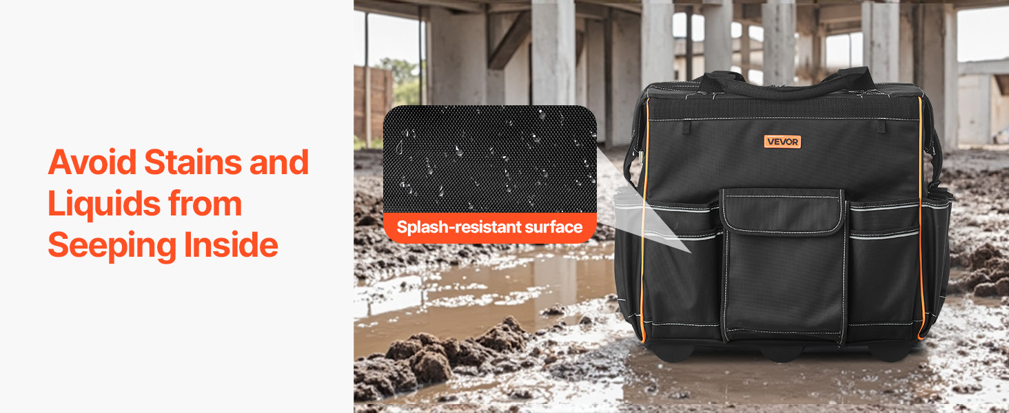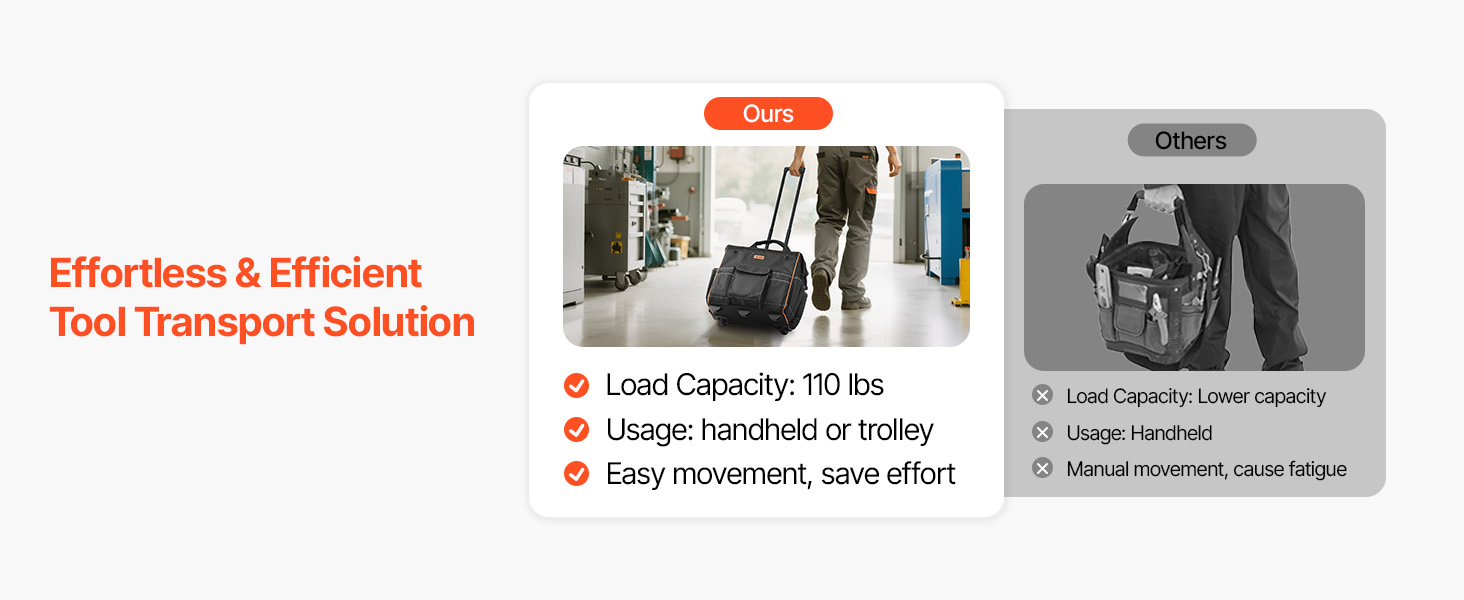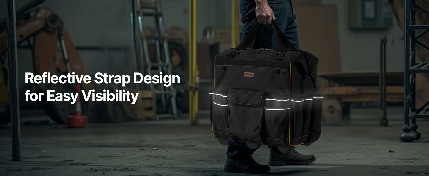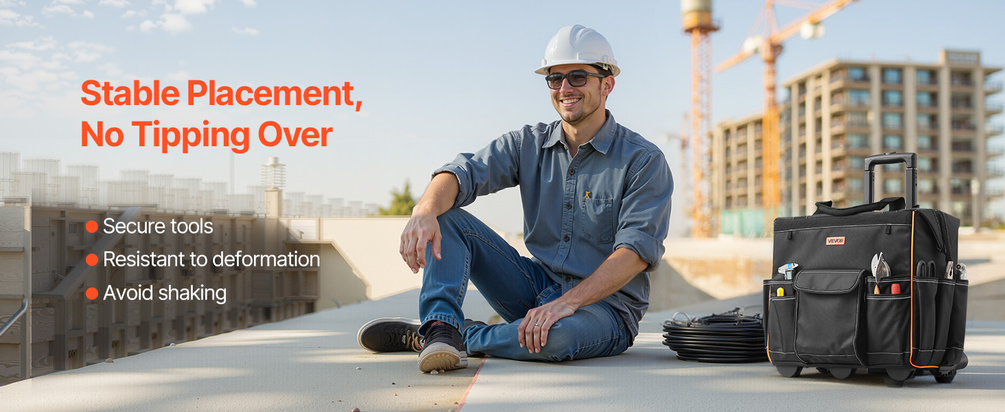 Realizzata in tessuto Oxford 1680D, questa robusta borsa portautensili con ruote è robusta e resistente agli strappi. Il fondo rinforzato e i piedini di supporto impediscono il ribaltamento, mantenendo gli attrezzi al sicuro e rendendo l'accesso facile e veloce.