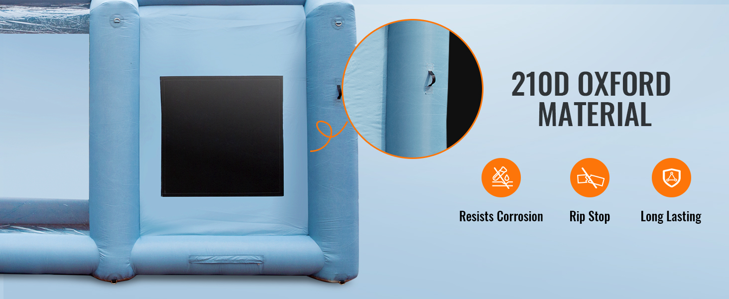 - Tessuto Oxford & PVC: la tenda gonfiabile per verniciatura è una combinazione di tessuto oxford 201D ispessito con rivestimento in PU e materiale in PVC da 4 mm, che offre una durata superiore e una protezione contro lo sporco.