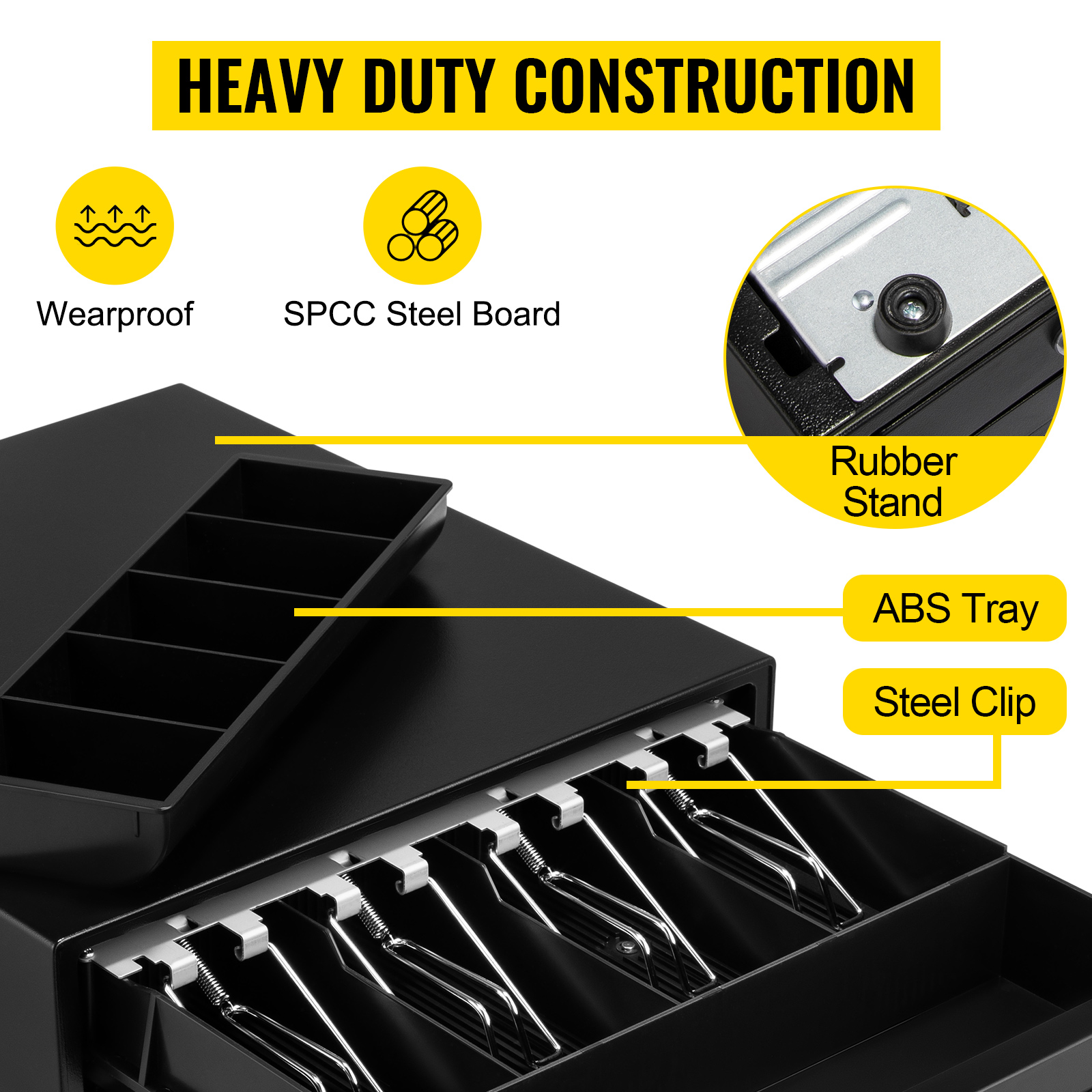 Questo cassetto della cassa è costituito da pannelli in acciaio resistenti e robusti, clip in acciaio e vassoi in plastica ABS. Tutti i materiali garantiscono un utilizzo durevole e di lunga durata. Inoltre, il robusto telaio in metallo previene in modo sicuro graffi o danni alle valute.