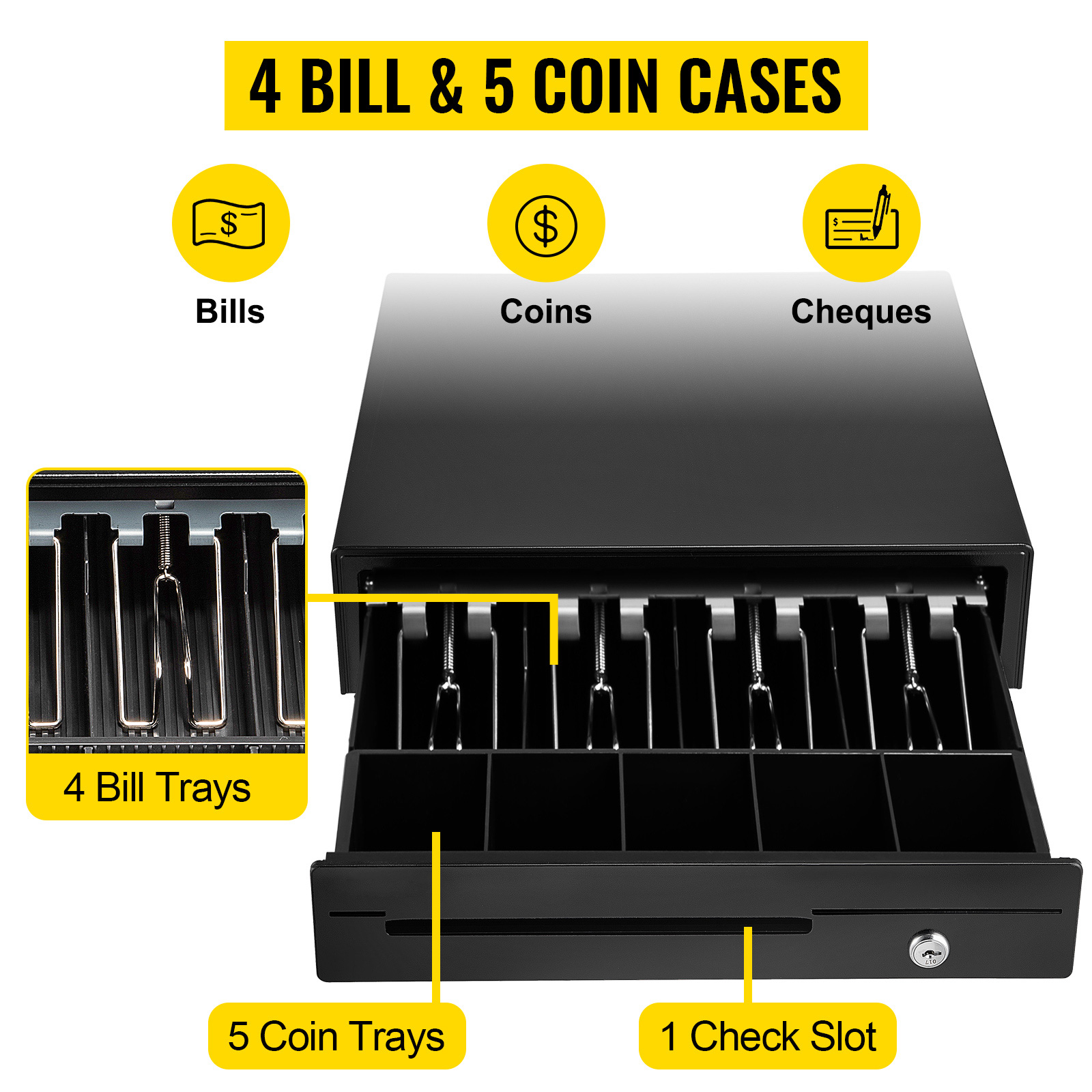 Sei infastidito quando si tratta di tenere organizzati contanti e monete? Il mini registratore di cassa VEVOR ti aiuterà a organizzarli in modo efficiente. È possibile utilizzare il cassetto contanti a lungo grazie alla sua scheda in acciaio premium e alla plastica ABS. Viene fornito con 4 vassoi per banconote e 5 vassoi per monete regolabili, che potrebbero mantenere in ordine i contanti o le monete.