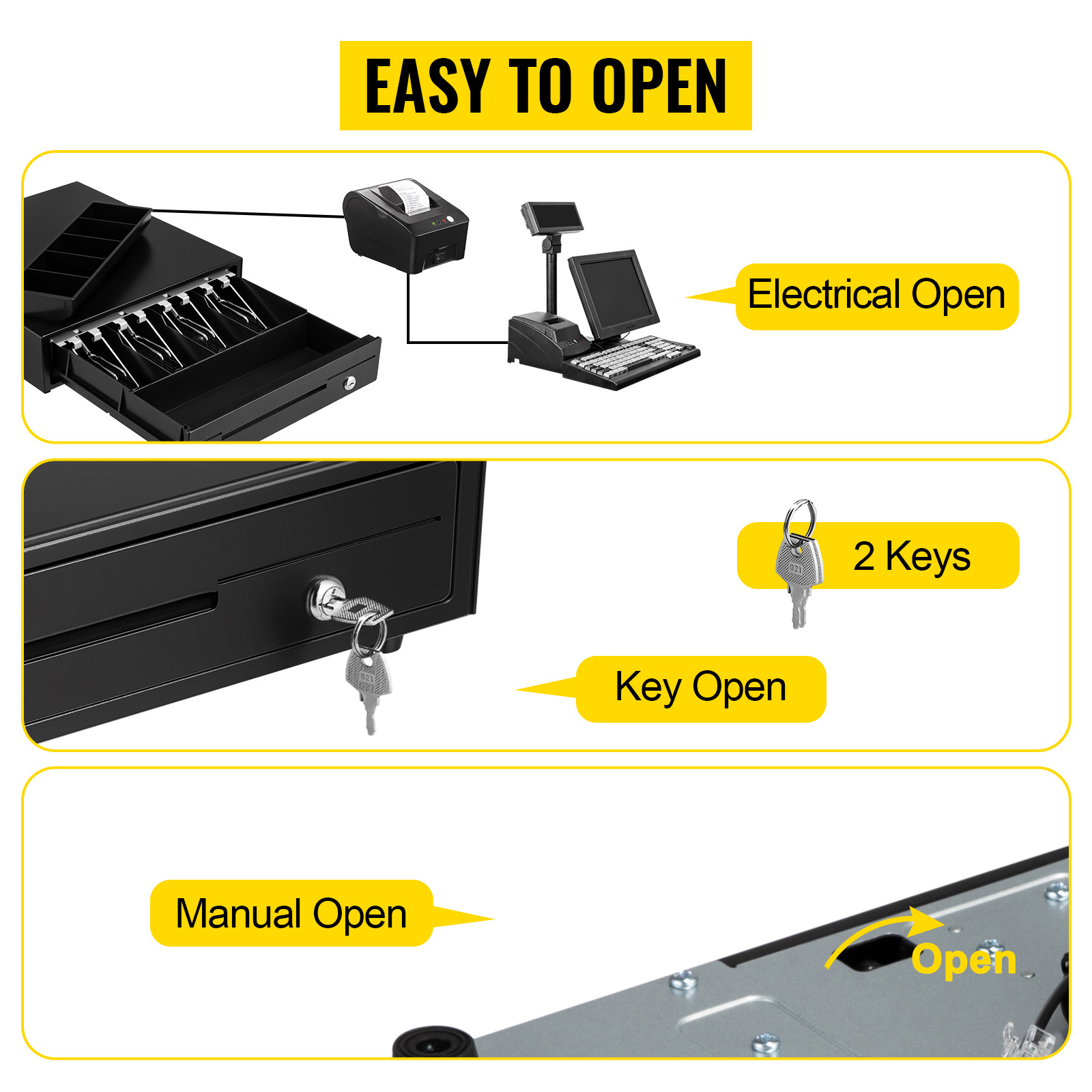 Il cassetto della cassa è protetto da 2 modalità di sblocco: apertura manuale, apertura a chiave. Se dimentichi la chiave o non c'è elettricità, c'è una leva di emergenza sul retro per sbloccarla.