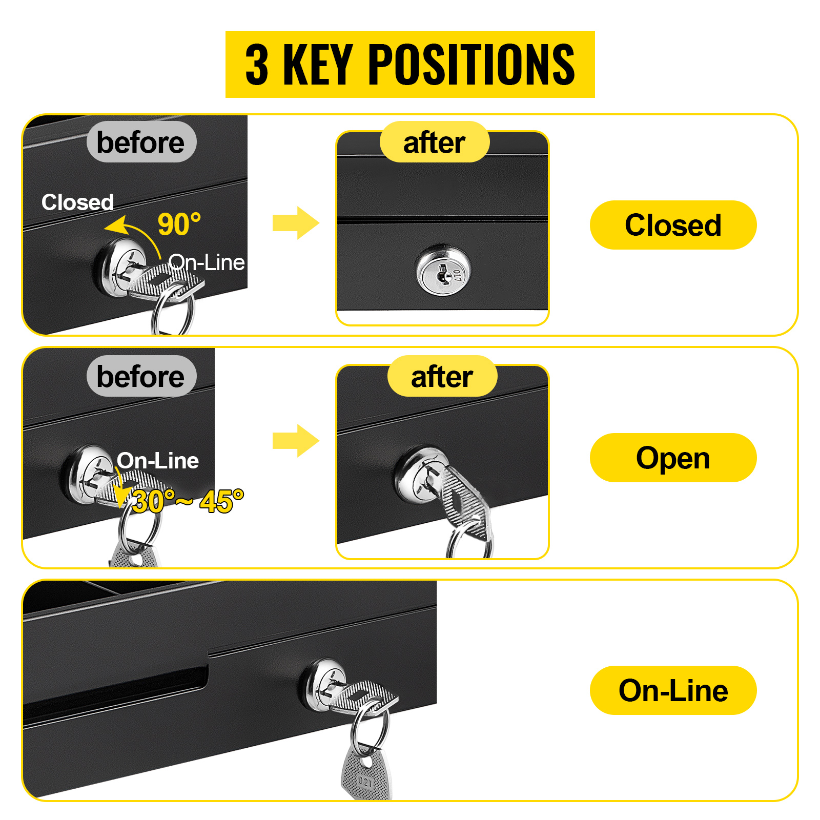 Il cassetto della scrivania viene fornito con 2 chiavi. Ci sono 3 posizioni chiave per utilizzare rapidamente il drawer: apri, online e chiudi. Basta inserire la chiave e poi ruotarla secondo le proprie esigenze.