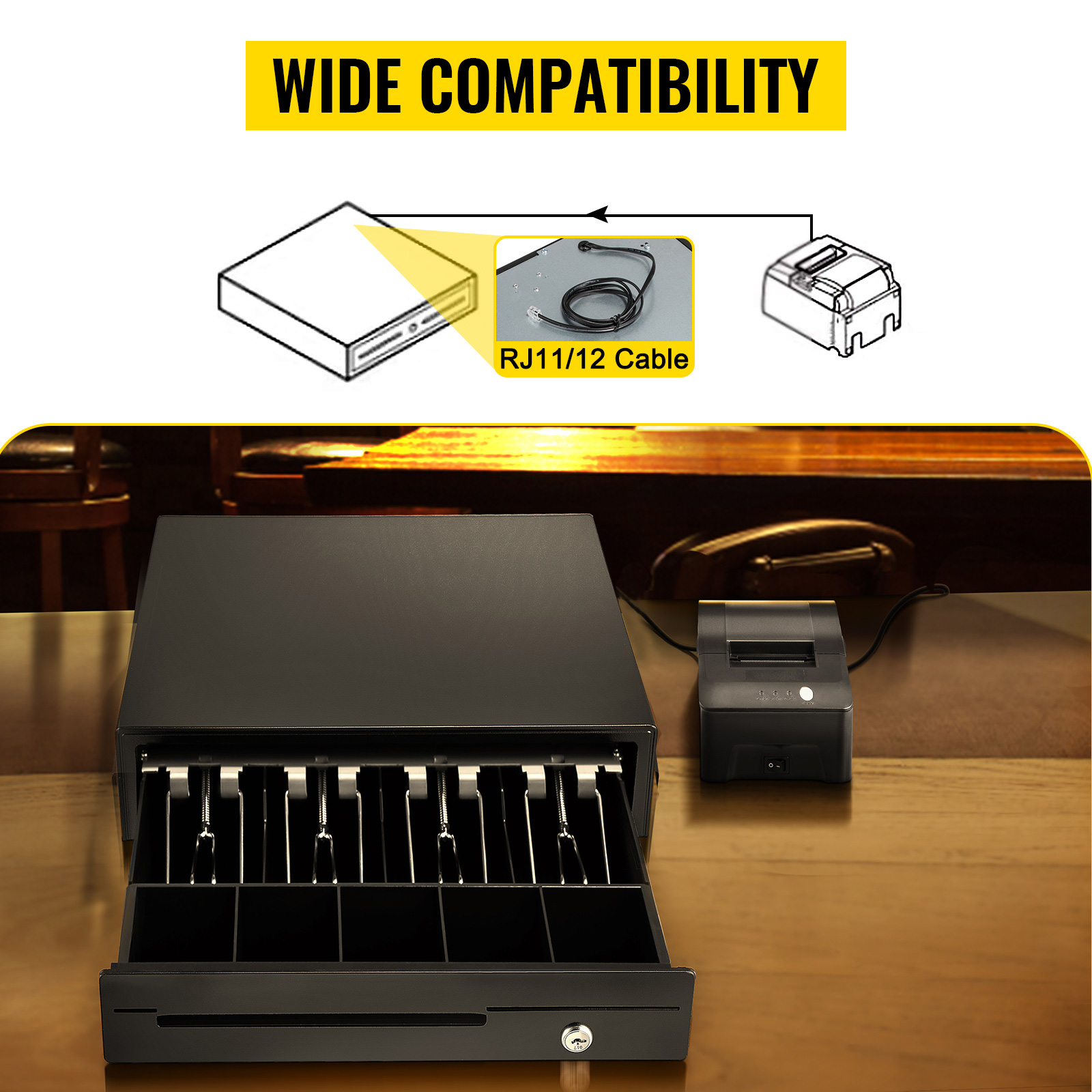 Il nostro piccolo cassetto contanti è dotato di una porta RJ11/RJ12 per collegarlo a una stampante per ricevute o altri dispositivi elettronici.