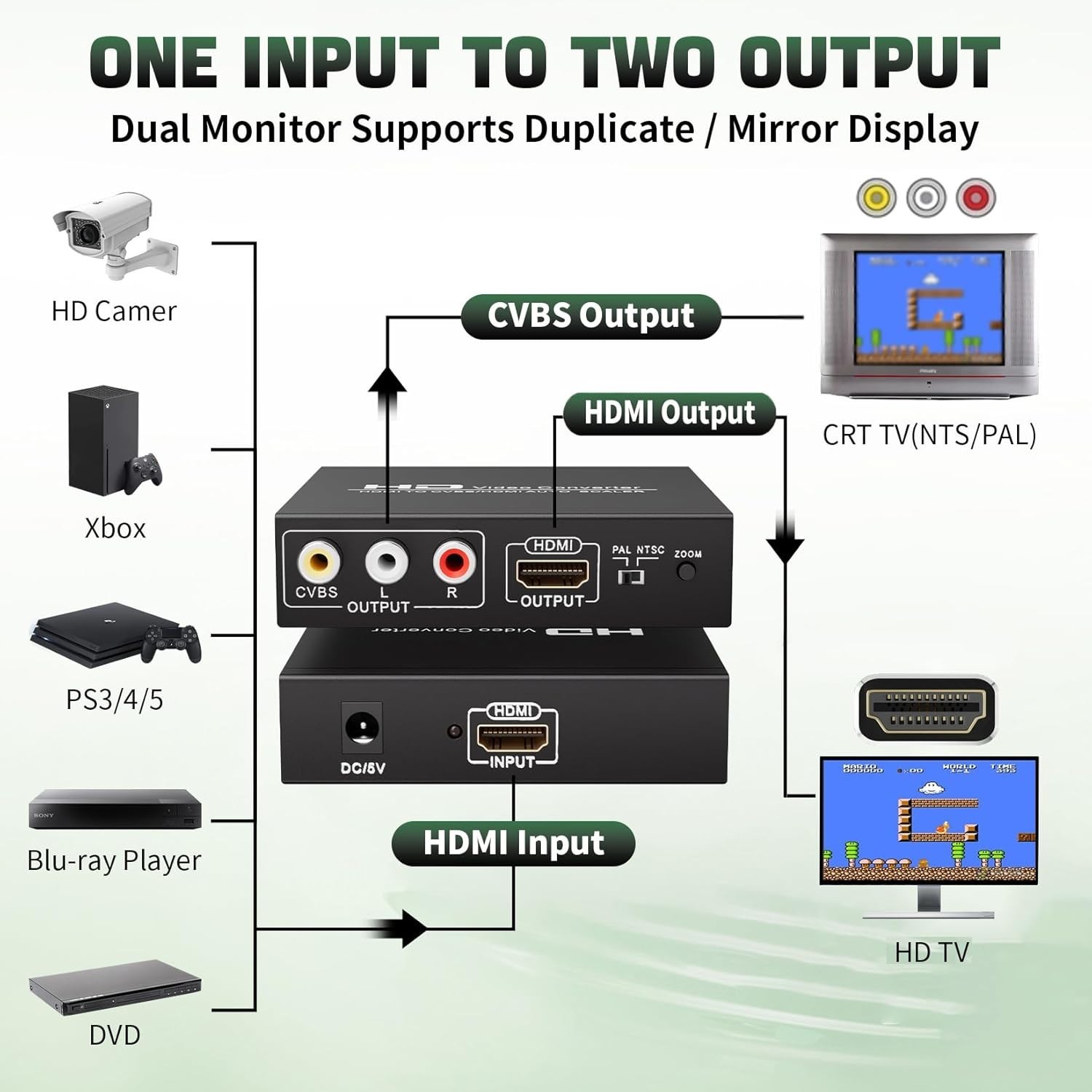 One Input to Two Outputs: Distribute one HDMI input signal to both HDMI output and composite video (CVBS) signal, along with L/R stereo audio output, transmitting video and audio simultaneously without any loss or lag.