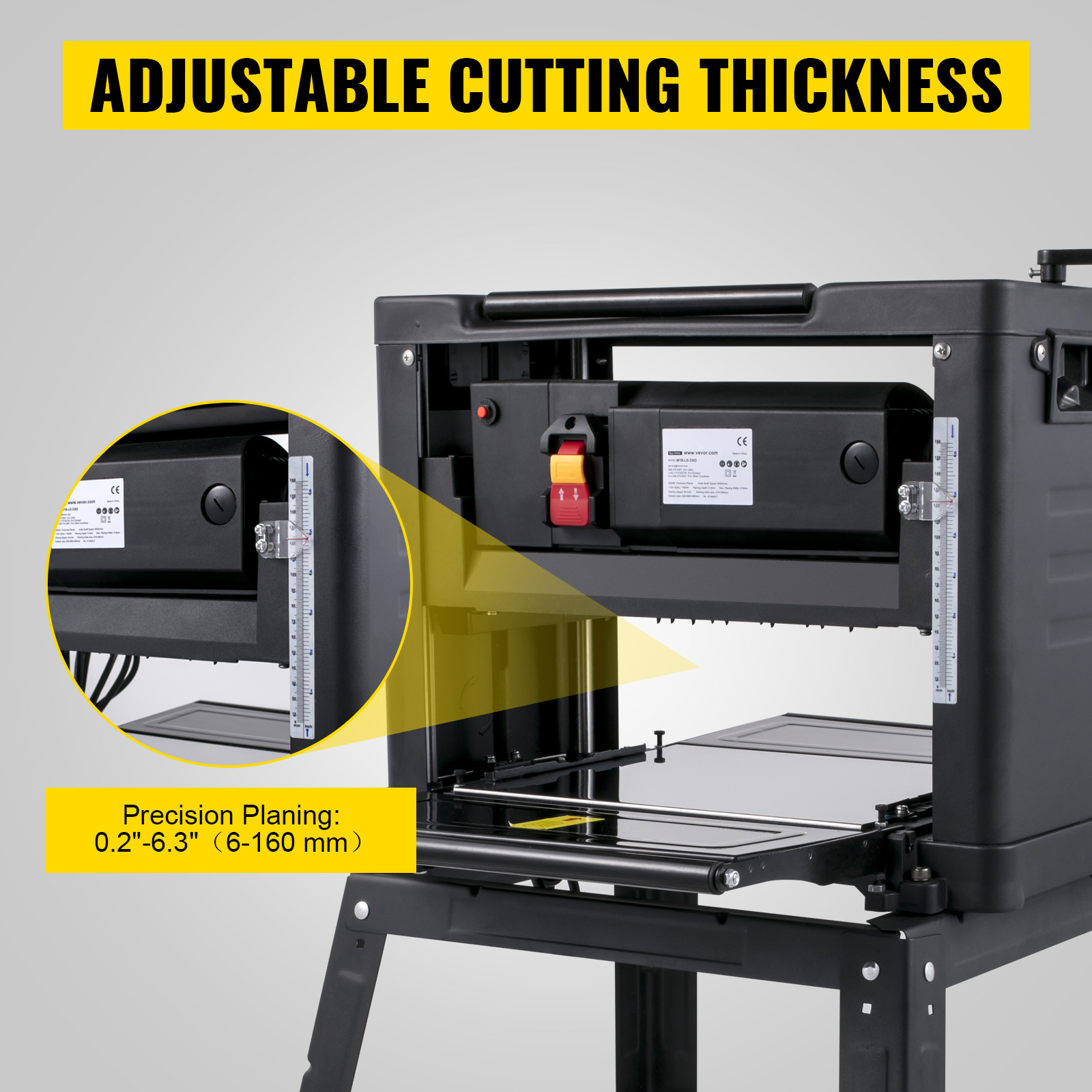 Spessore di taglio: 0,2"-6,3" (6-160 mm). Grazie alla manovella, la regolazione dell'altezza della testa di taglio sembra un gioco da ragazzi, che potrebbe soddisfare diverse esigenze di taglio. E la scala graduata è progettata per una regolazione accurata della profondità di taglio e una lavorazione precisa.