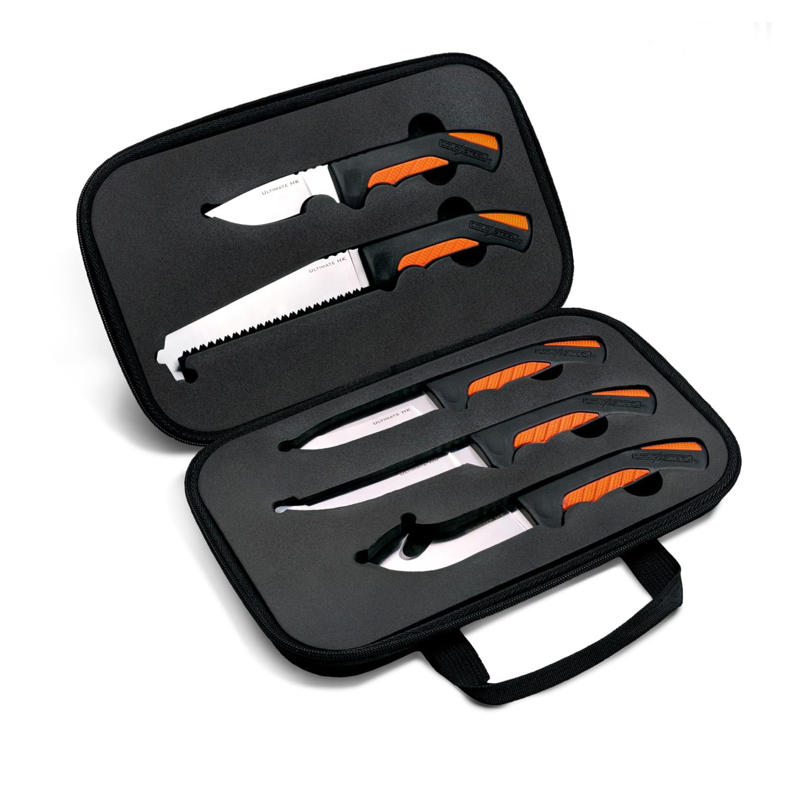 New Fixed Blade Hunting Kit Satin finish 4116 stainless blade. Black and orange rubberized TPR handle. Includes: 10.88" overall bone saw with 6" serrated blade; 9.88" overall boning with 5" blade; 8.88" overall skinner with 4" guthook blade; 8.88" overall general purpose with 4" blade; 8.38" overall caping with 3.5" blade. Comes in zippered storage case. Boxed.