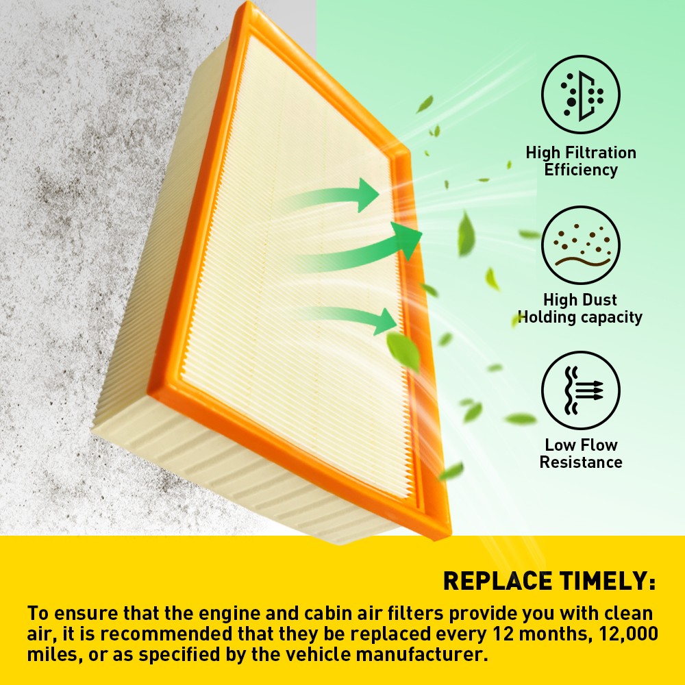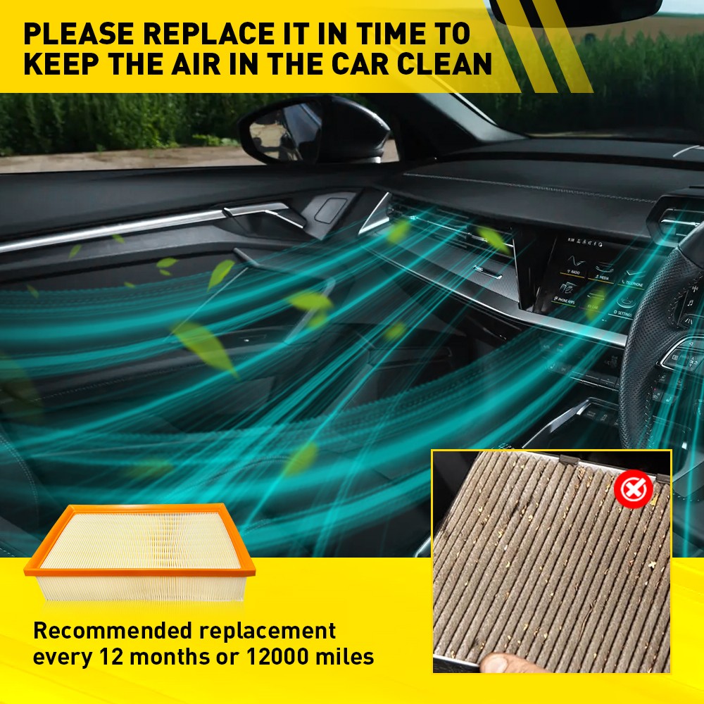 To ensure that the filter provide you with clean air, recommended replacement every 12 months, 12,000 miles or as specified by the vehicle manufacturer.