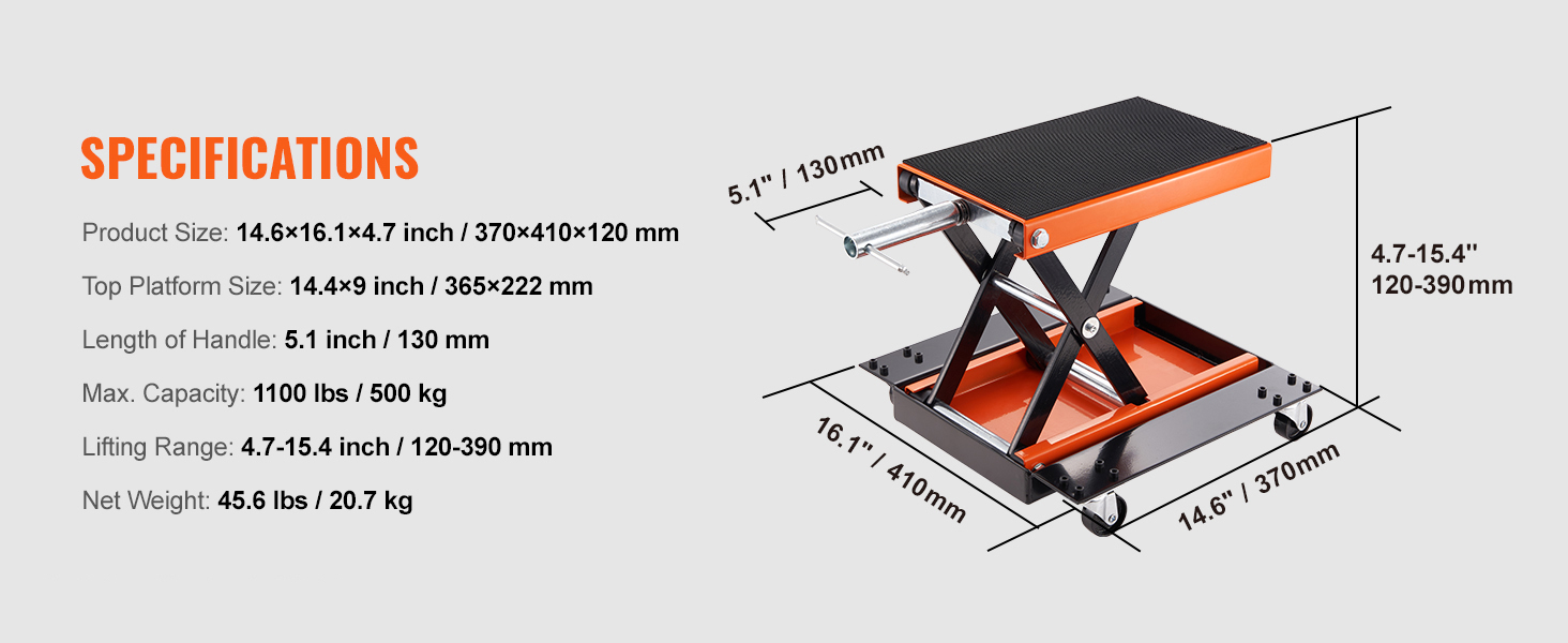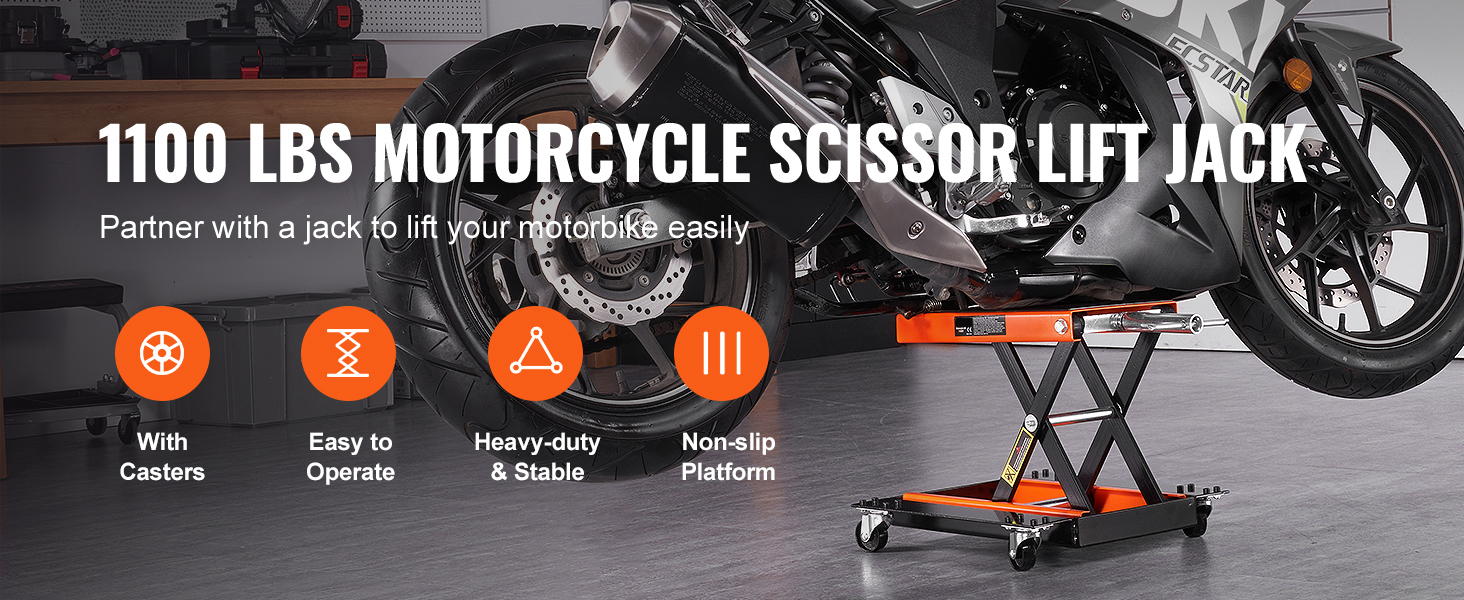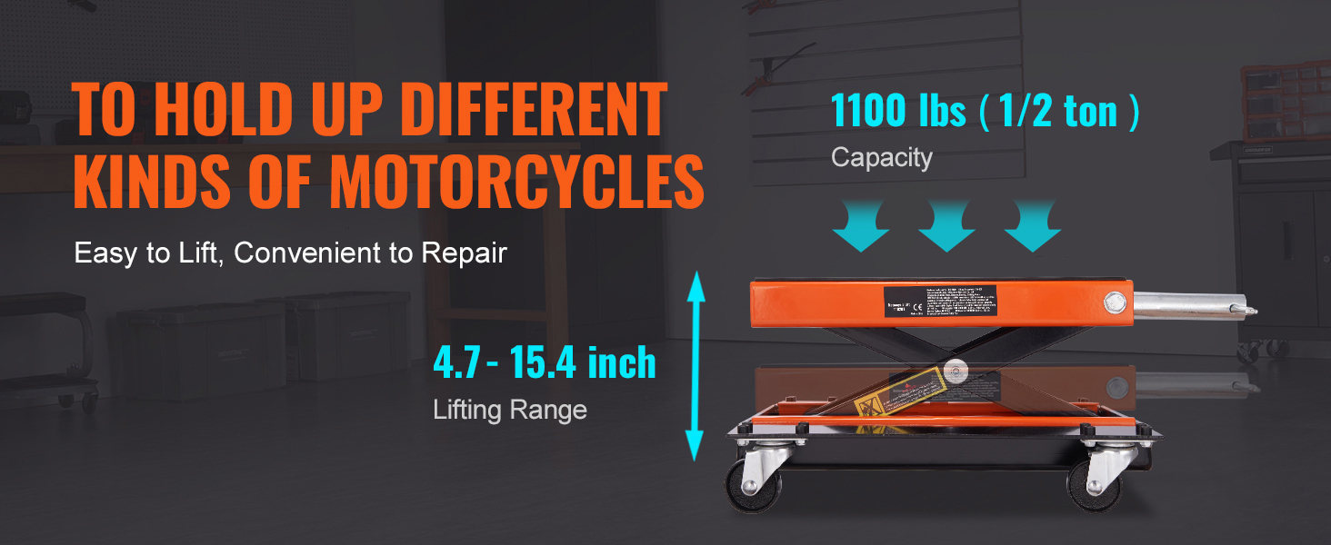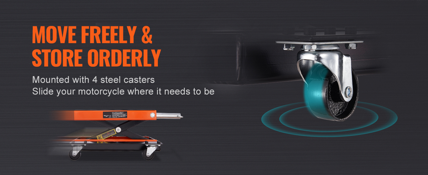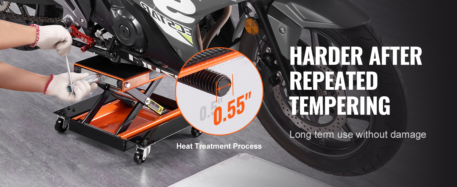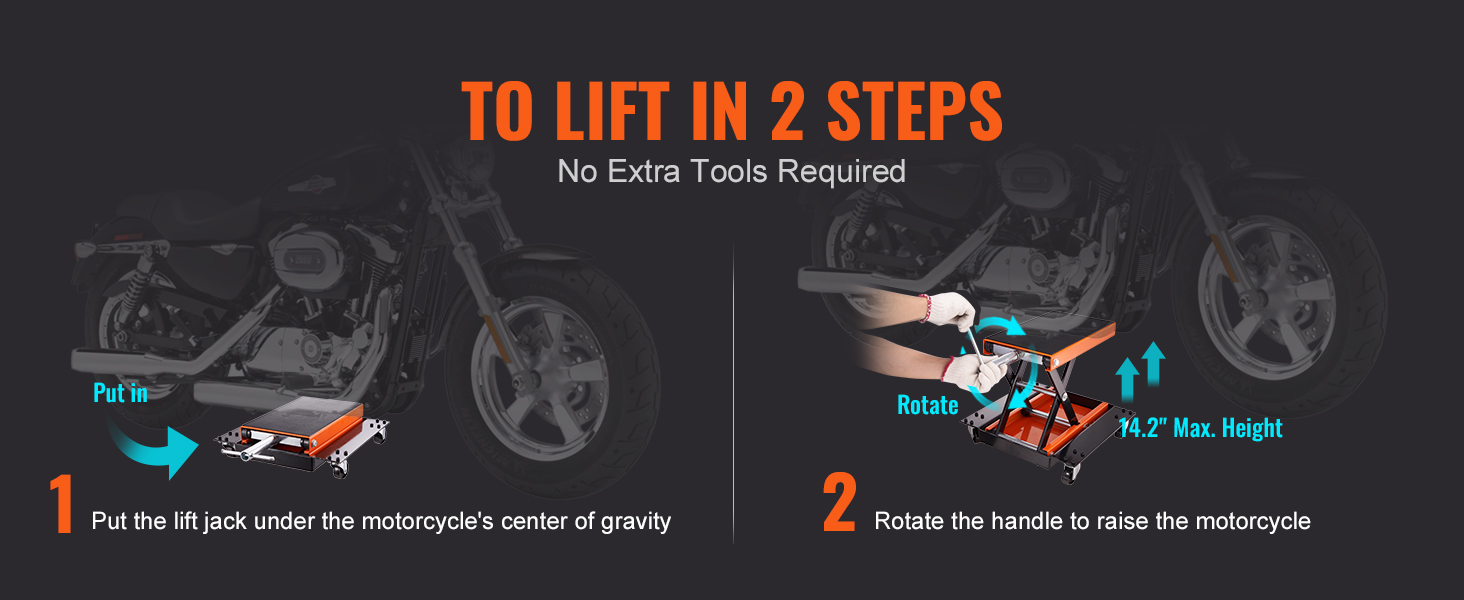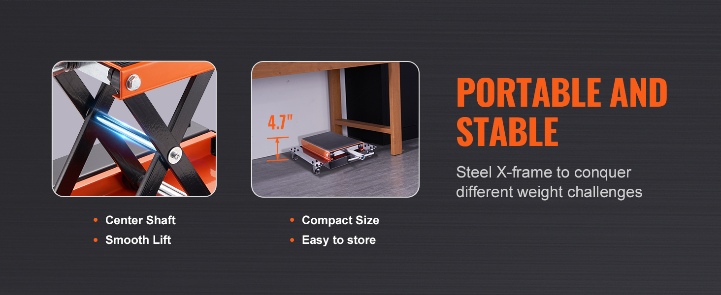 Il telaio solido a forma di X in acciaio ha un albero centrale che si muove su e giù in modo facile, permettendoti di fissare facilmente il tuo veicolo a diverse altezze. Il sollevatore per moto è progettato anche per rimanere stabile dopo aver smesso di ruotare la maniglia. Tuttavia, tieni presente che una volta raggiunto il punto più alto, non continuare a ruotare la maniglia per evitare di danneggiare l'asta della vite e provocarne la rottura.
