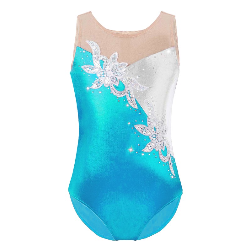 Patchwork designed leotard with glittering sequins and diamonds adorned, makes girls eye-catching on the stage.