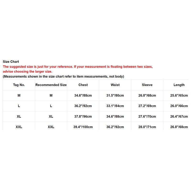 | Tag No. | Recommended Size | Chest | Waist | Sleeve | Length |