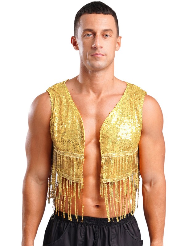 Designed with open front, collarless, sleeveless, fully lining and sequined surface, shiny sequin fringes sway as you move.