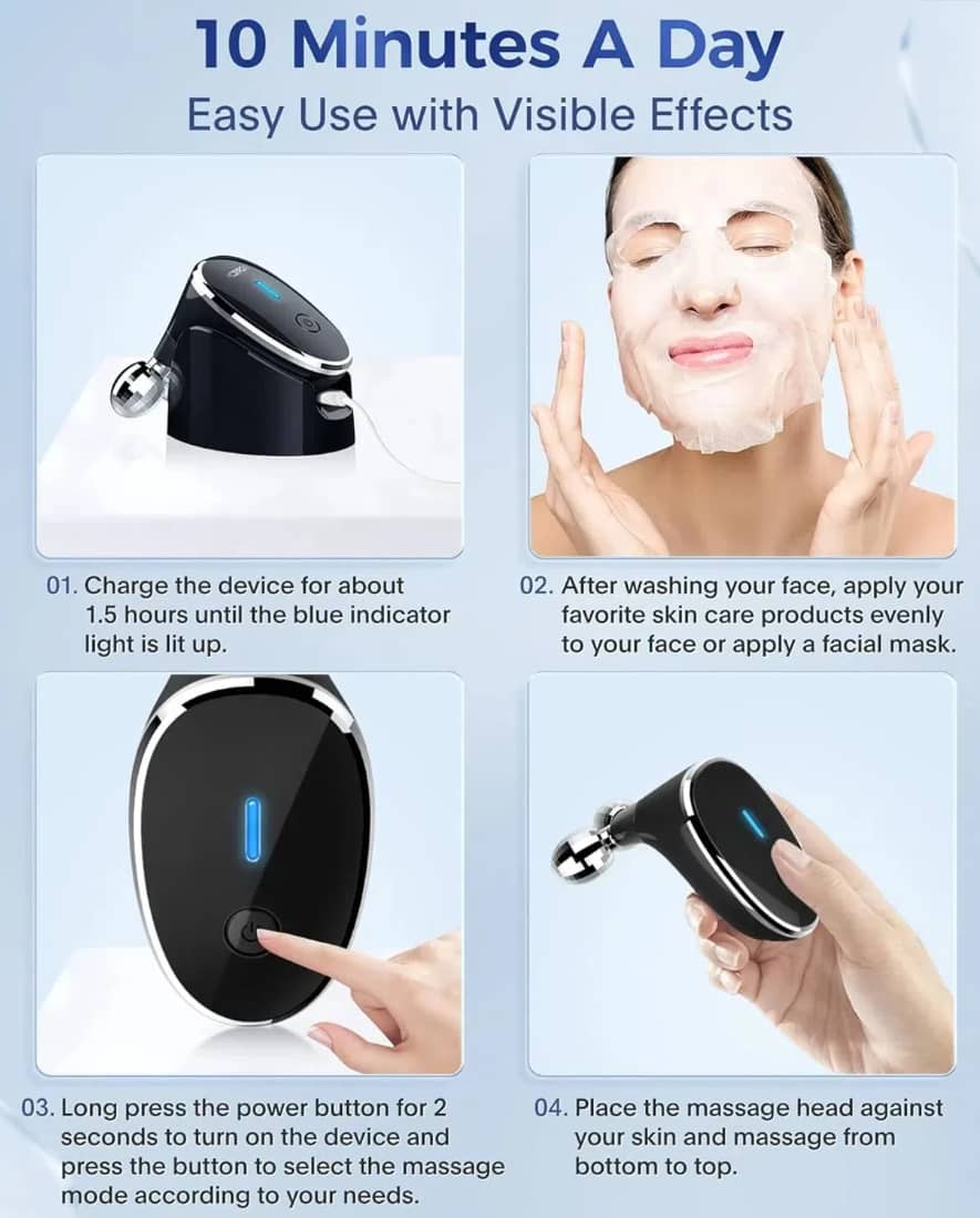 [Convenient to Carry] Ergonomic and lightweight, this face roller comes with a holder, a detailed user manual and a USB-C charging cable, which can be carried in the handbag and used anywhere.