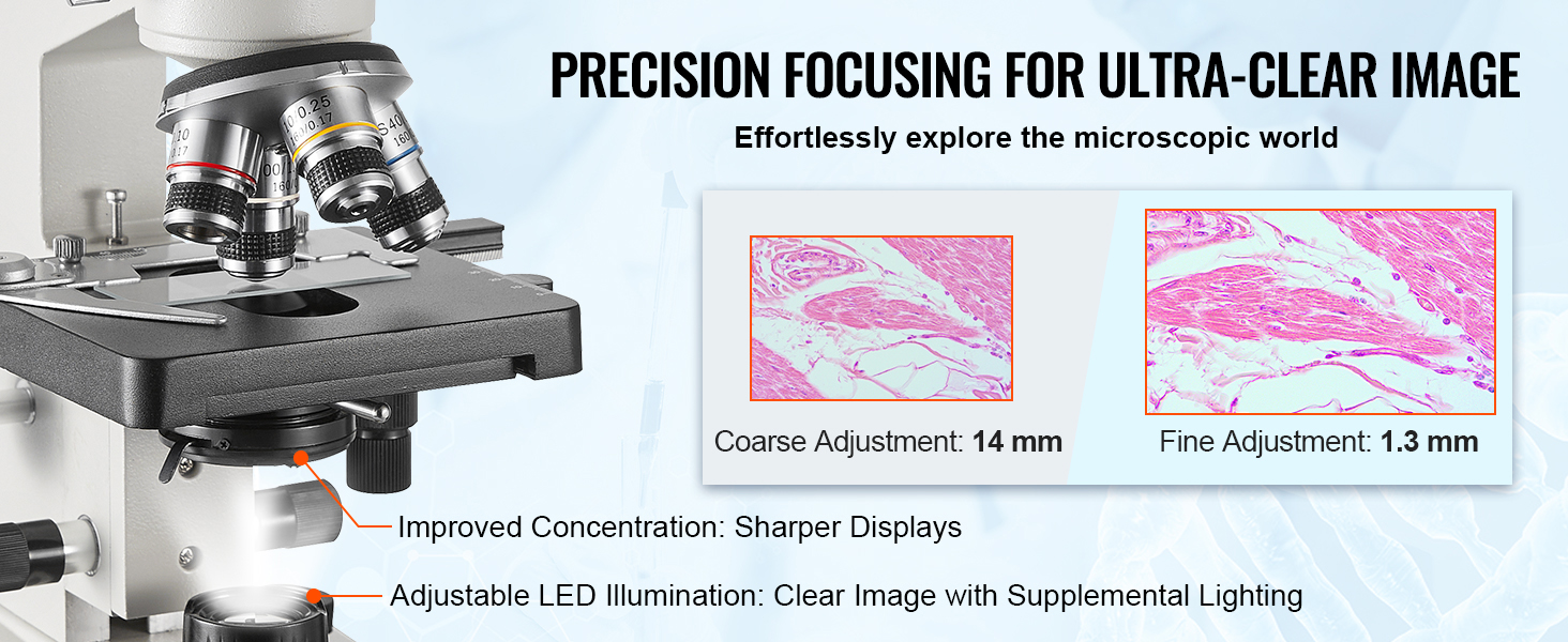 Sistema di Messa a Fuoco di Precisione: dotato di un sistema di messa a fuoco preciso, questo microscopio trinoculare da laboratorio offre regolazioni grossolane e fini per una messa a fuoco fluida e precisa. Il sistema di illuminazione a LED regolabile si adatta alle diverse condizioni di luce, garantendo un'illuminazione ottimale per immagini chiare.