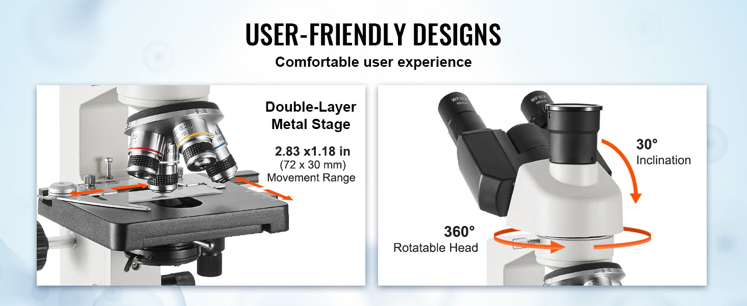 Design Facile da Usare: progettato con un palcoscenico a doppio strato per fissare i campioni, il microscopio è dotato di una testa di osservazione rotante per una maggiore facilità d'uso. Le manopole di messa a fuoco ergonomiche consentono di regolare la messa a fuoco senza sforzo, per una comoda esperienza d'uso.
