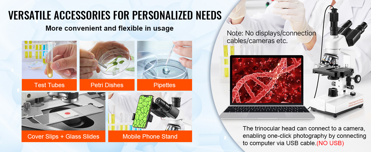 Kit Completo di Accessori: comprende coprioggetti, vetrini, provette, piatti di coltura e altri accessori necessari per una varietà di esperimenti e osservazioni. Il dispositivo è inoltre dotato di un'interfaccia per schermo esterno che consente di collegarlo facilmente al computer e di scattare foto con un semplice clic. Che si tratti di ricerca biologica, diagnostica medica o scienze ambientali, il dispositivo supporta un'ampia gamma di esperimenti e attività di ricerca.