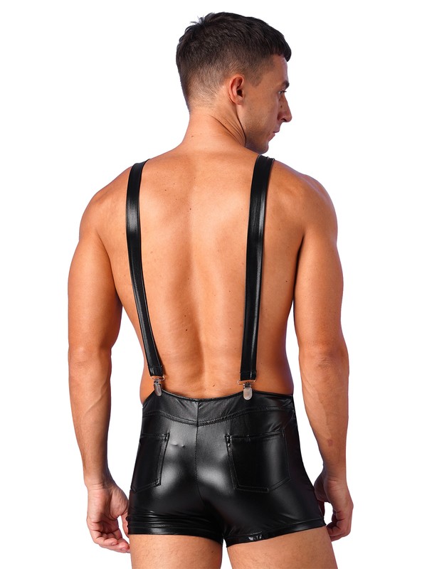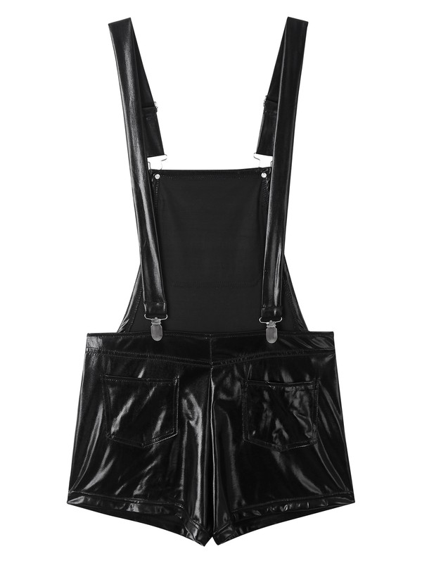 Men’s shiny metallic bib overall suspender shorts festival fancy dress, pull on closure.