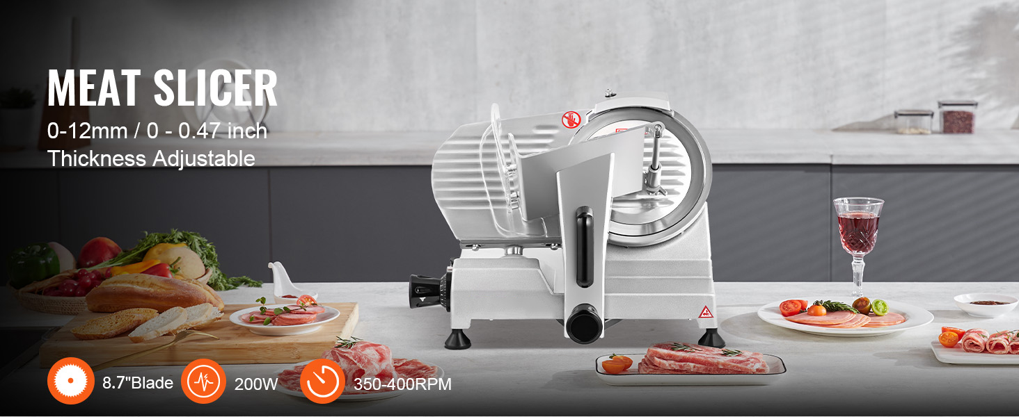 La nostra affettatrice è dotata di un motore ad alta efficienza da 200 W e una velocità di taglio di 350-400 giri al minuto, che ti consente di affettare istantaneamente i tuoi ingredienti preferiti. Che si tratti di carne, formaggi, pane o verdure, ti fa risparmiare tempo prezioso nella preparazione del cibo.