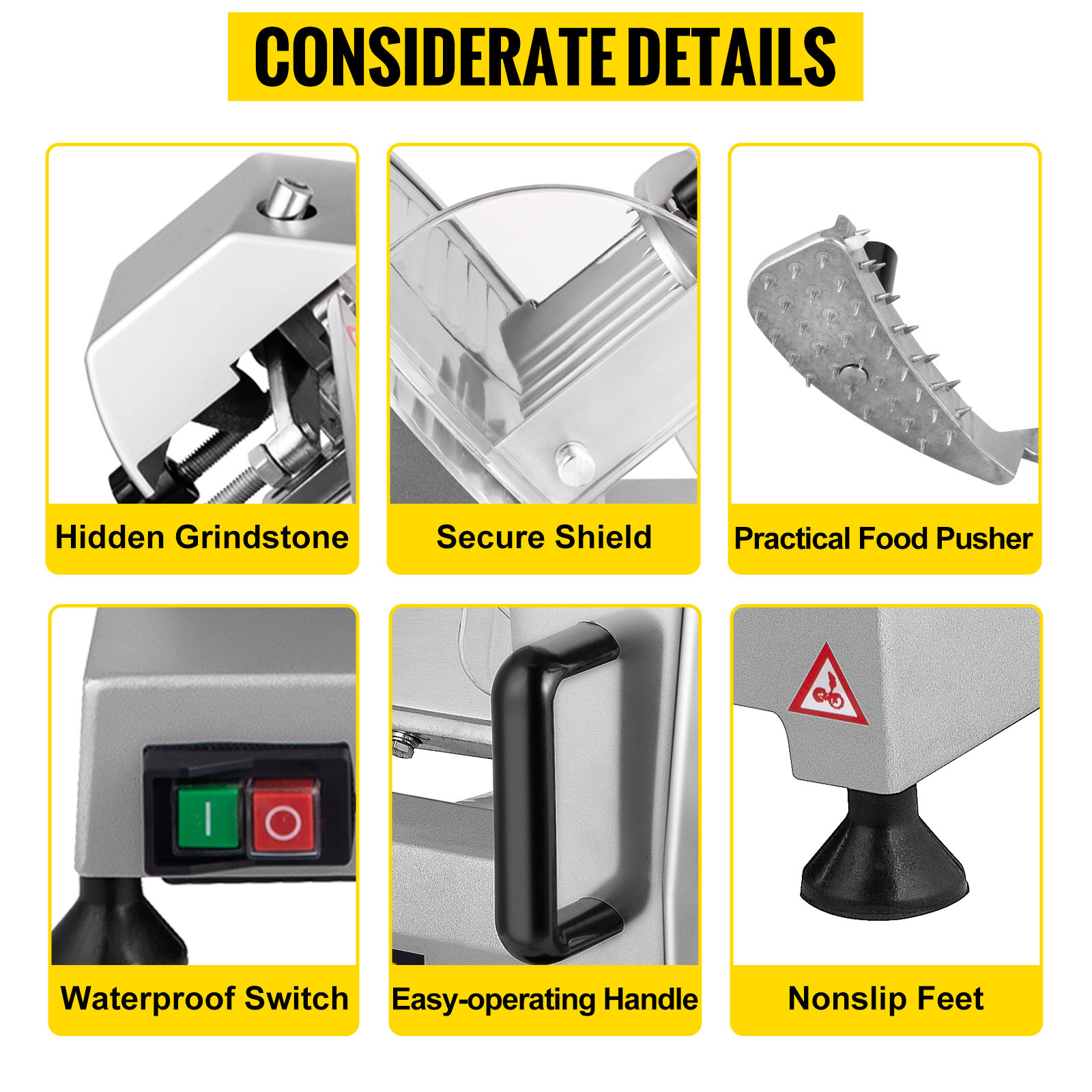 Le mole nascoste sono comode per affilare la lama. Lo scudo di sicurezza può evitare incidenti imprevisti. Lo spingicibo è attrezzato per trattenere saldamente il cibo da affettare sul piatto. L'interruttore on/off impermeabile è facile da usare. I piedini in gomma antiscivolo sono progettati per un uso stabile.