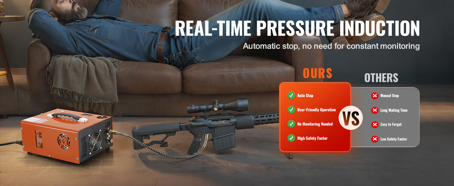 Gonfiaggio Preciso a Portata di Mano: il compressore d'aria VEVOR PCP è dotato di un sistema intelligente a doppio display che fornisce letture di pressione e temperatura in tempo reale. Con una pressione massima di 30 MPa, soddisfa perfettamente le esigenze delle diverse pistole ad aria compressa.
