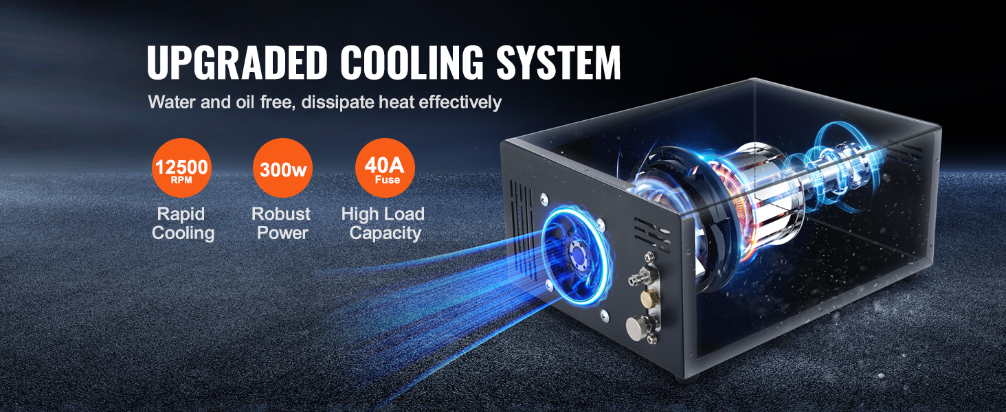 Il compressore d'aria per immersioni adotta un sistema di raffreddamento migliorato e un design privo di acqua e olio. Dotato di una velocità della ventola di 12500 giri/min, motore da 300 W e fusibile da 40 A, offre prestazioni potenti e può sopportare carichi elevati.