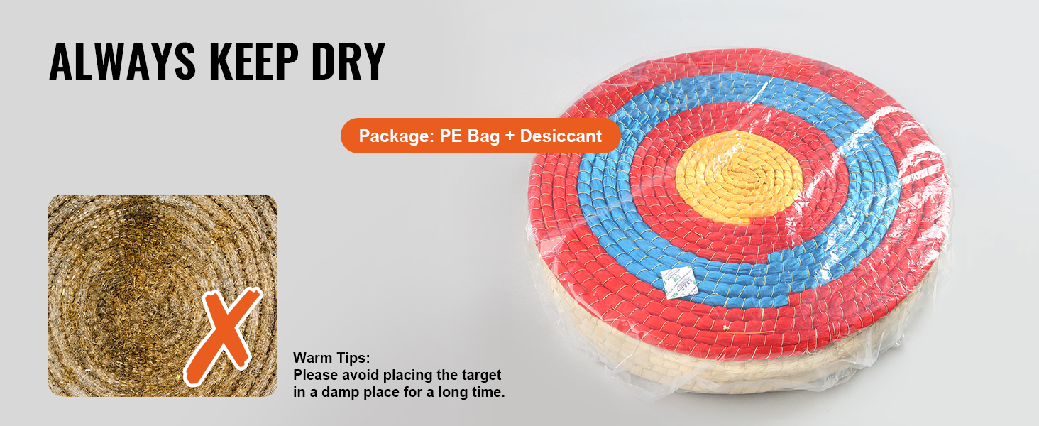 Stoccaggio a Secco Migliorato: ci concentriamo sulla durata del tuo bersaglio in corda colorata. Ecco perché nella confezione abbiamo fornito un sacchetto in PE e un essiccante per mantenere asciutto il tuo obiettivo. Evitare di posizionare il bersaglio in un luogo umido per lunghi periodi di tempo, per mantenerlo in perfette condizioni per il vostro piacere di tiro.