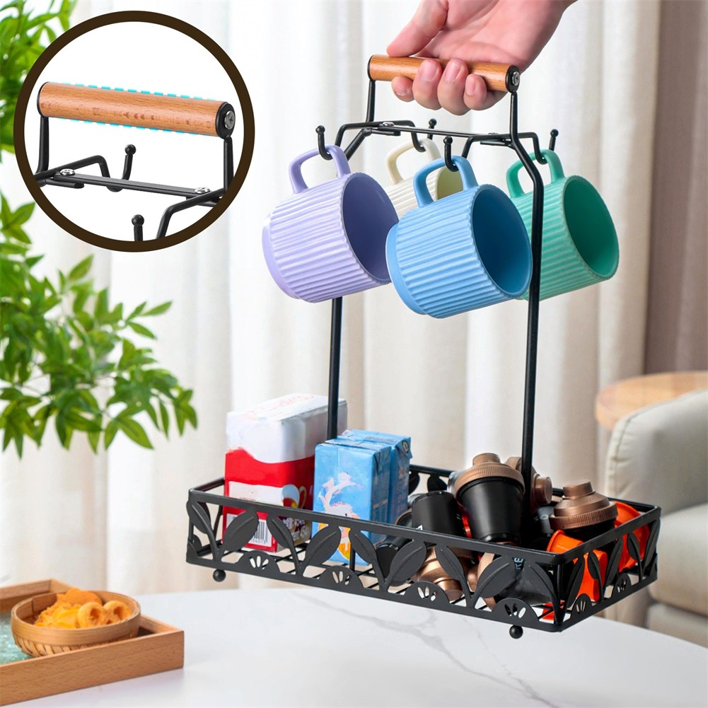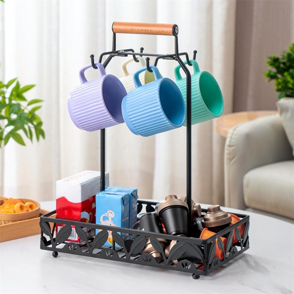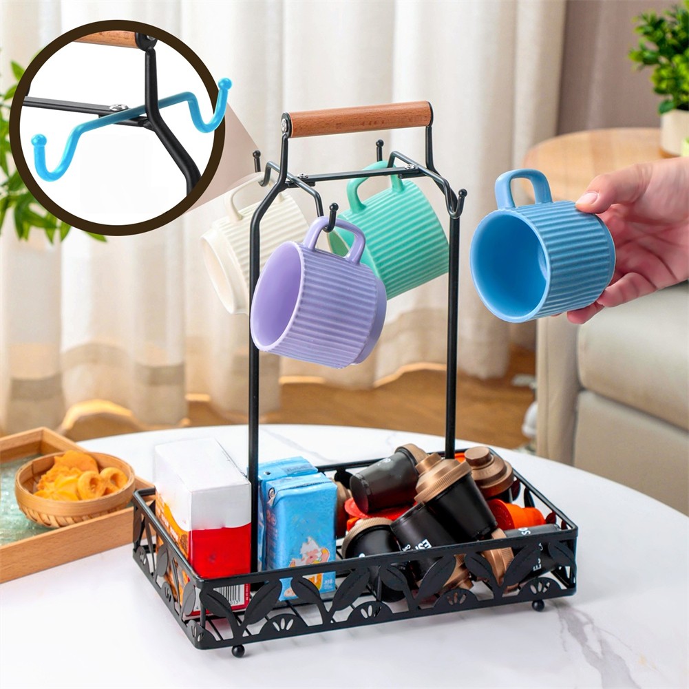 Metal Coffee Mug Rack Kitchen Counter Cup Holder with 4Hooks Coffee Capsule Tray