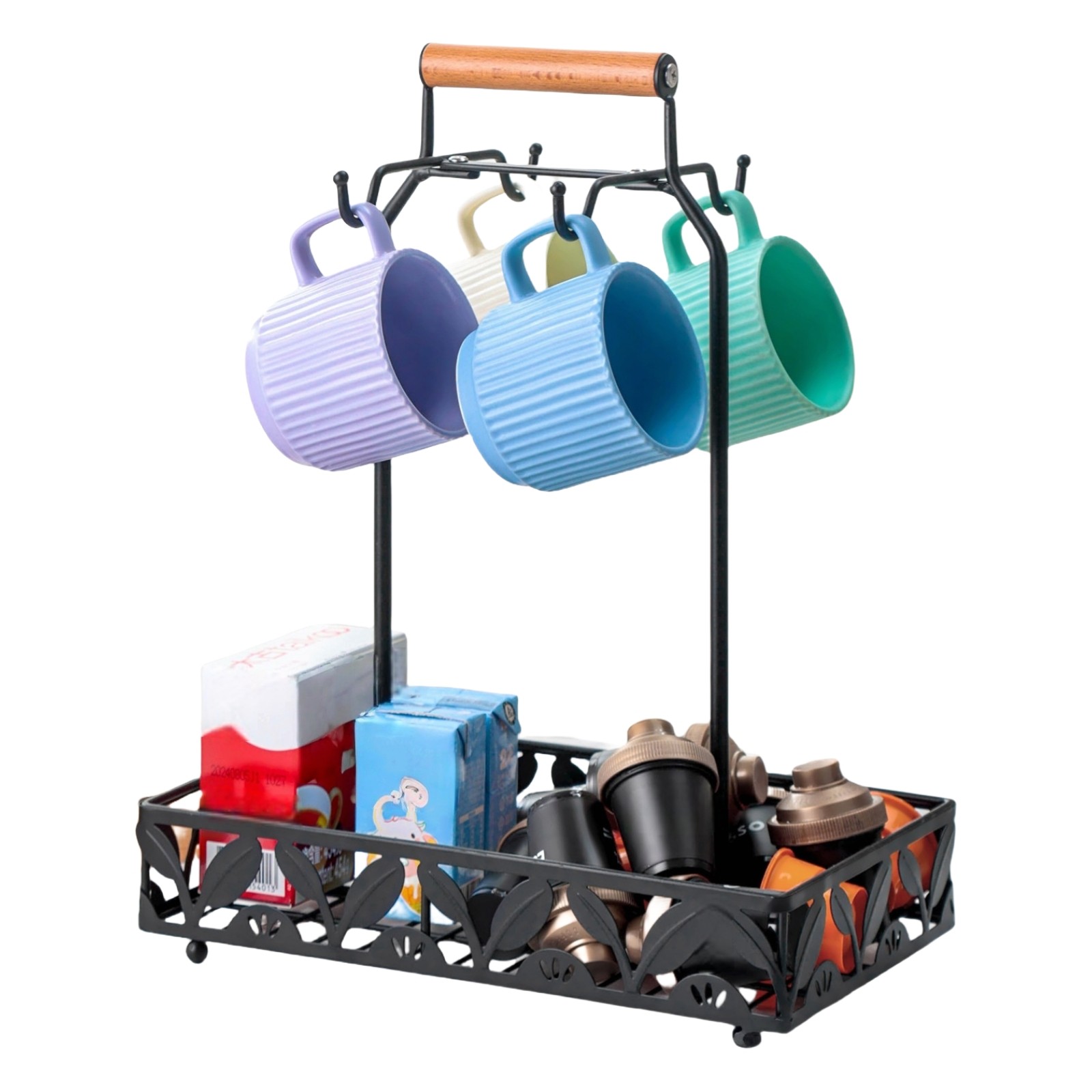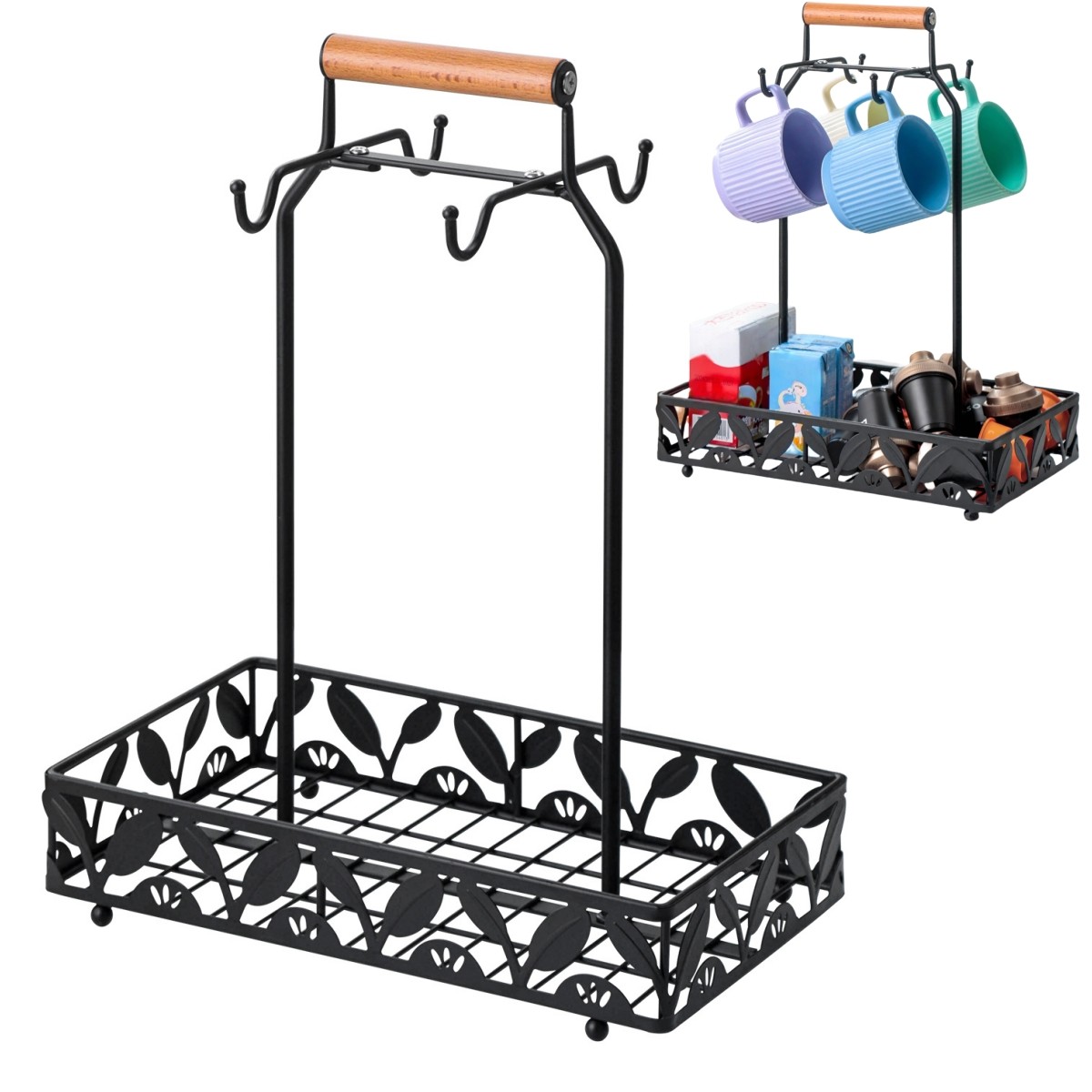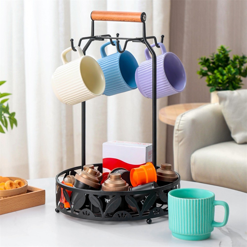 Metal Coffee Mug Rack Kitchen Counter Cup Holder with 4Hooks Coffee Capsule Tray