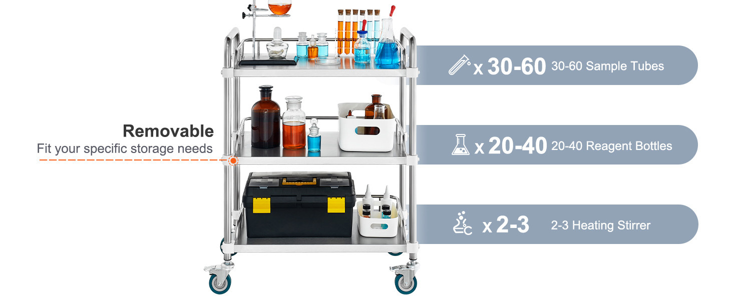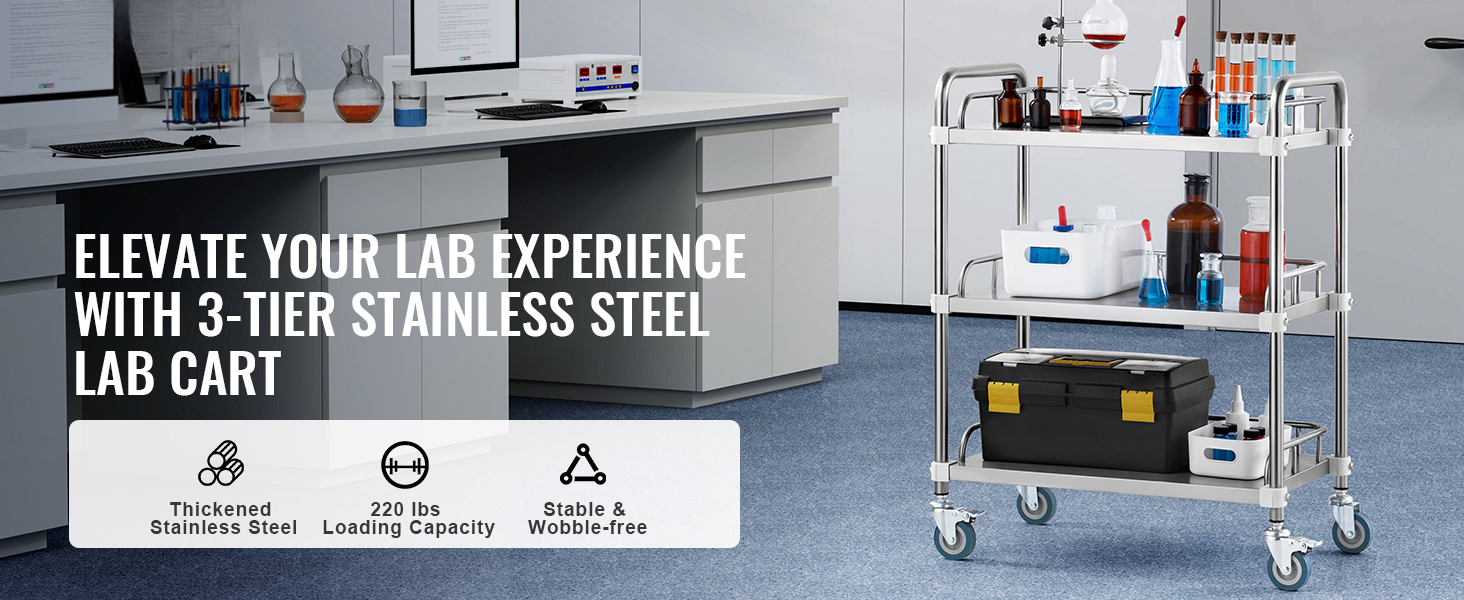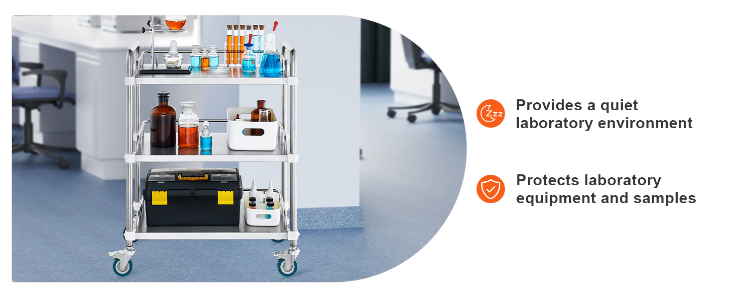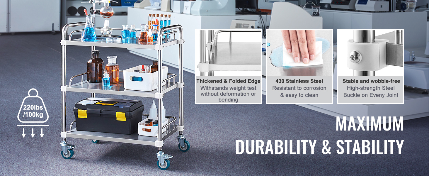Acciaio inossidabile resistente: costruito in solido acciaio inossidabile, questo carrello da laboratorio può supportare fino a 220 libbre di attrezzature e forniture. La sua superficie resistente alla ruggine garantisce una facile pulizia, rendendolo perfetto per gli ambienti di laboratorio.
