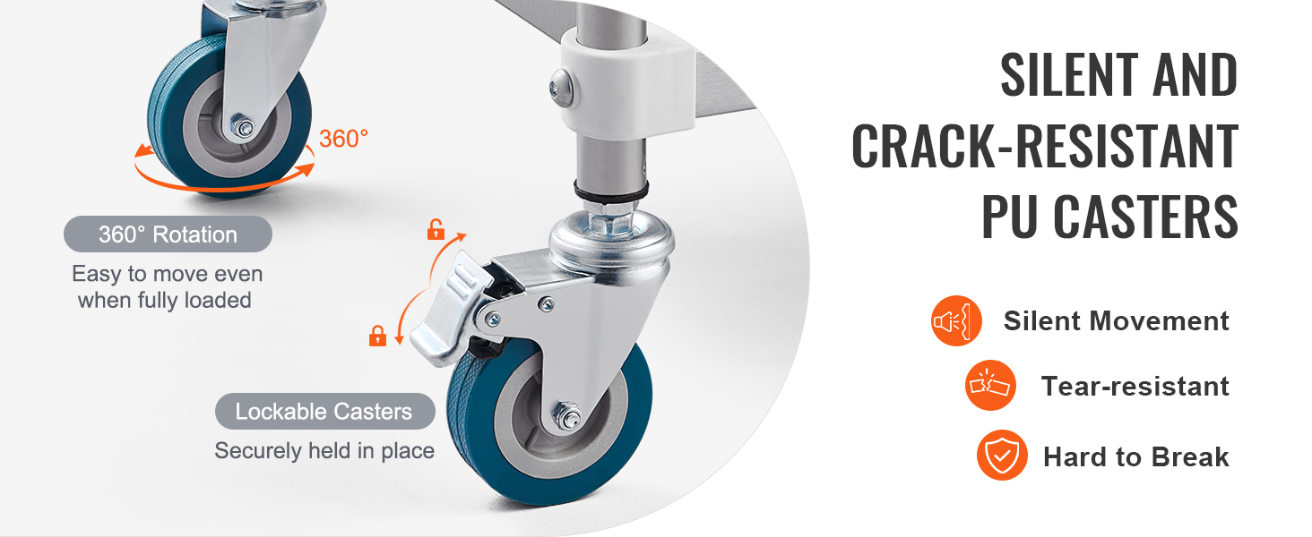 Mobilità senza sforzo: dotato di quattro ruote universali e rotelle silenziose, questo carrello si muove agevolmente anche a pieno carico. Due rotelle bloccabili garantiscono stabilità su superfici irregolari. L'ampia maniglia garantisce una presa comoda per una facile manovrabilità.