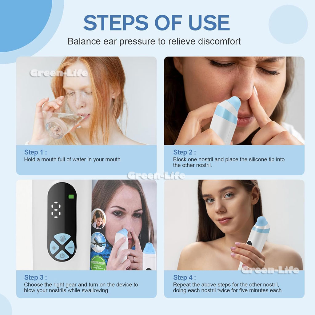 【Easy to Use】 1. Having amouthful of water in mouth. 2. Block one nostrils and place the silicone head into the other side of the nostrils. 3. Select the appropriate gear, turn on the ear pressure relief device to blow the nostrils, and swallowing at the same time. 4. Repeat the steps for the other nostril, two times for each nostril, for five minutes each time