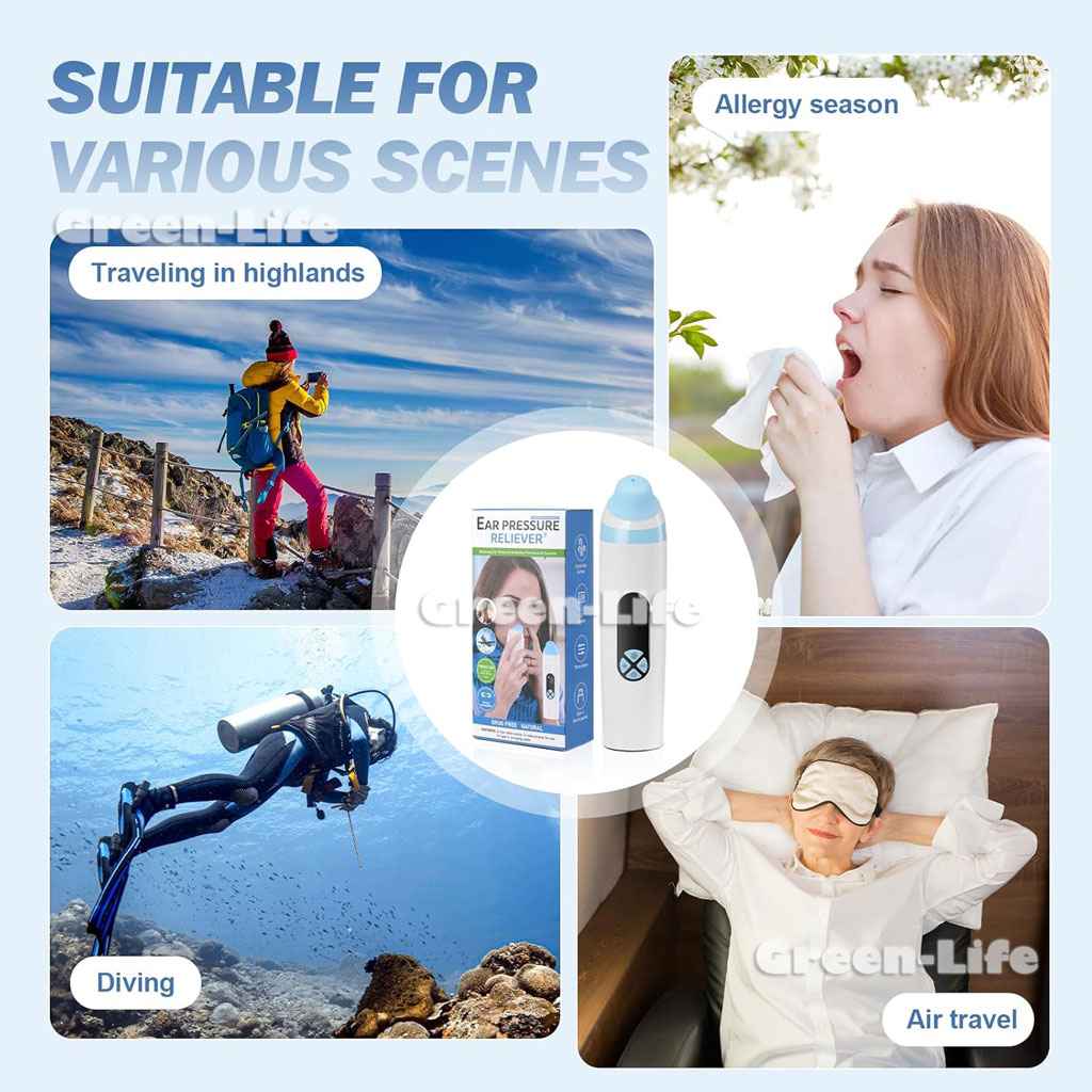 【Relieves Nasal Congestion】Our ear pressure relief device pushes a steady airstream into the nasal passages, quickly opening the eustachian tubes and allowing fluids to drain more easily, while balancing barometric pressure and relieving congestion and bloating due to changes in altitude, nasal congestion, and earplugs.