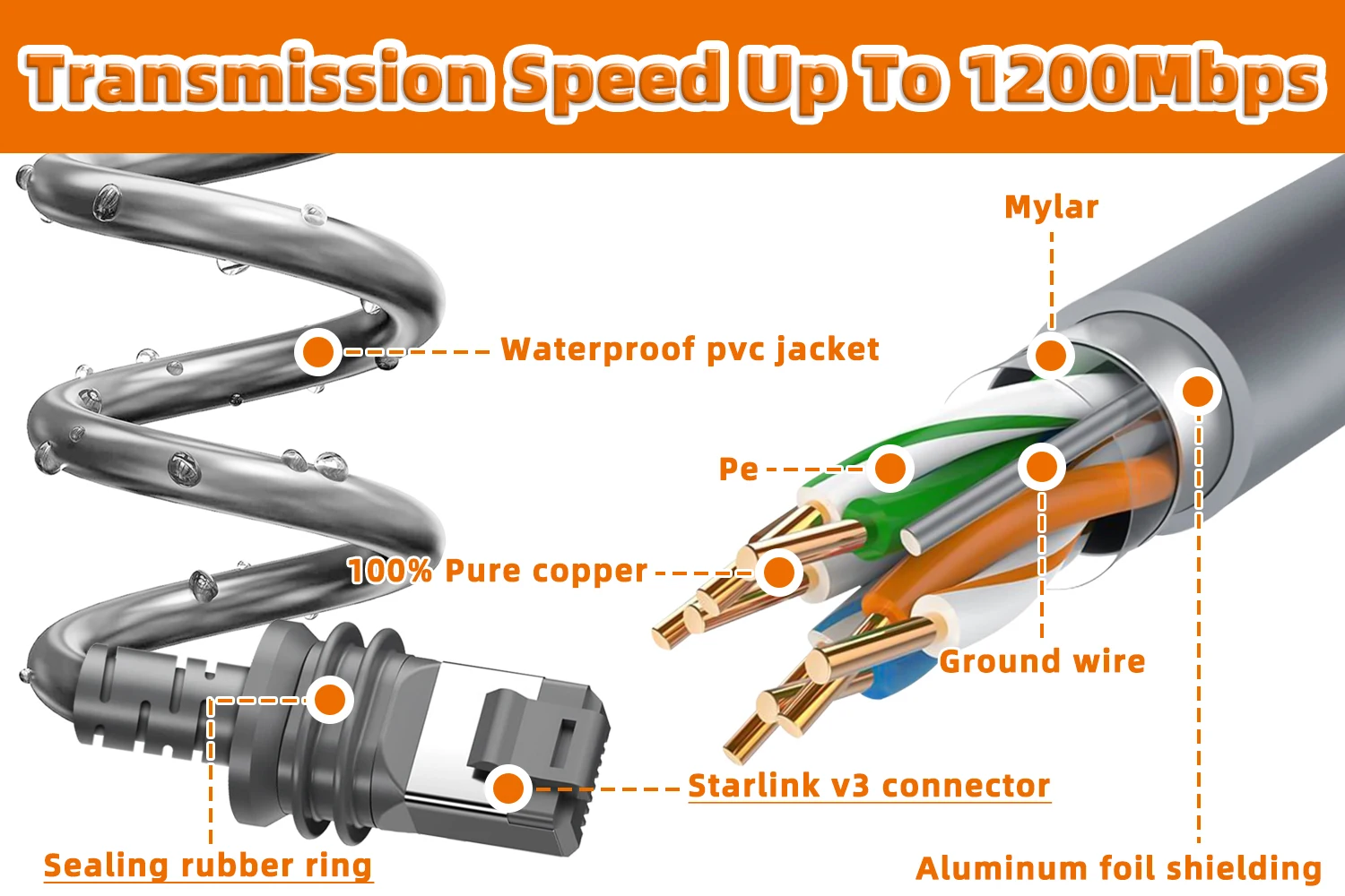 Crafted with high-quality materials, the Starlink Gen 3 Cable Extension Cord features a robust internal structure that prioritizes signal integrity and durability.The Starlink Gen 3 Cableis designed with four pairs of twisted wires, 100% original copper, PE shell, aluminum foil shielding to make the network cable more stable, and the unique sealing rubber ring to seal the connection to prevent water.