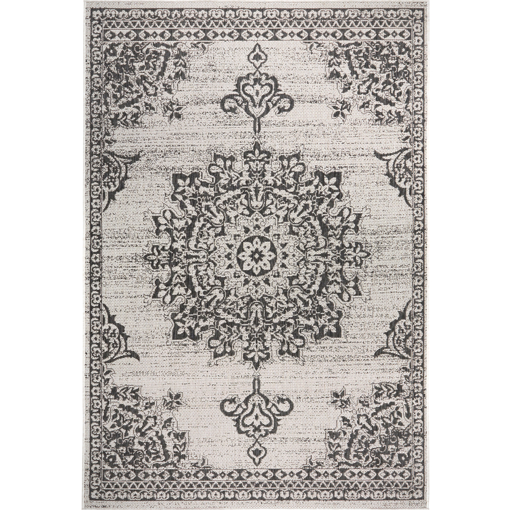 Transform any living space with designer inspired, textured indoor/outdoor woven rugs by Nicole Miller. This stylish collection offers the perfect combination of durability, fashion and comfort. Adding decorative floor coverings is one of the easiest ways to elevate any entertainment space including patios, decks and screened in porches. Collection includes an eclectic mix of color pallets and visual designs with medallions, Victorian spades, large borders, repeat shapes and unique distressed looks. Décor friendly colors and timeless design choices compliment any existing décor. Use on your patio with outdoor furniture and accessories to create your personal style. The lightweight, easy to clean polypropylene material is low maintenance and won’t scratch your deck surface. These versatile and functional rugs enhance indoor, high traffic areas in the home such as kitchens, play rooms, mud rooms and more. Roll rugs for quick and easy storage throughout the year. Use with non-skid padding underneath is recommended (sold separately). Size Range: 5' x 7', Color Family: Blacks & Grays, Material: Synthetics, Shape: Rectangle