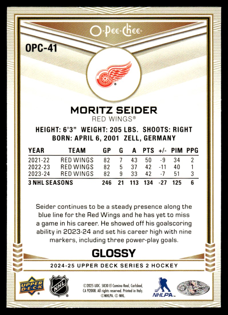 | 2024-25 Upper Deck O-Pee-Chee Glossy Moritz Seider Detroit Red Wings #OPC-41 |