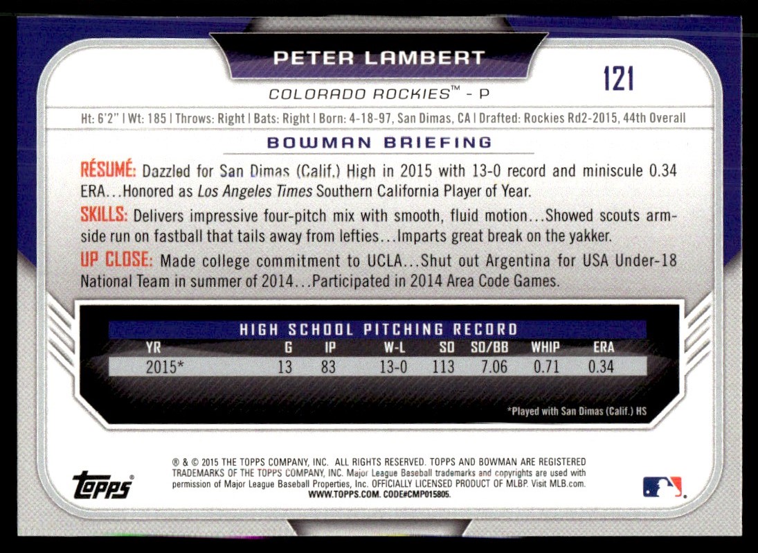 | 2015 Bowman Draft Picks & Prospects Peter Lambert Colorado Rockies #121 |