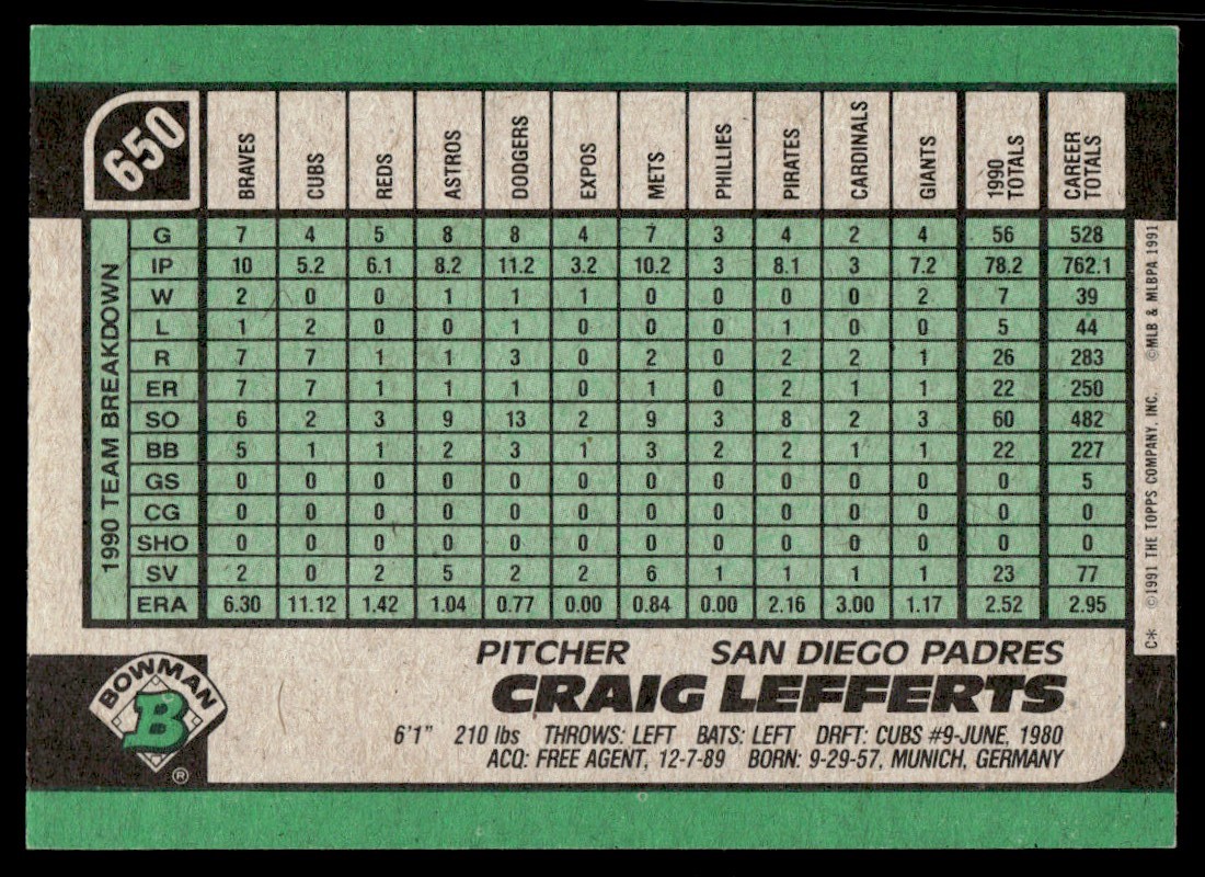 | 1991 Bowman Craig Lefferts San Diego Padres #650 |