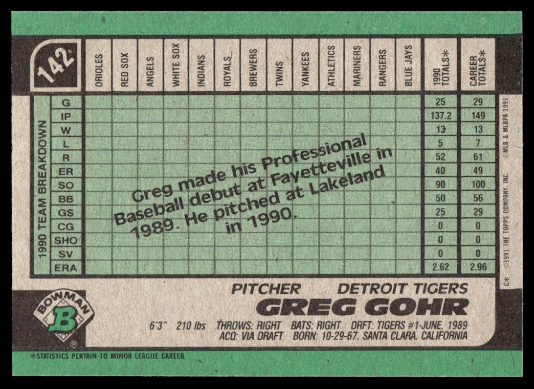 | 1991 Bowman Greg Gohr Detroit Tigers #142 |